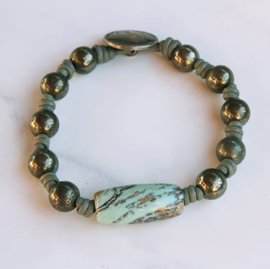 Pyrite and Agate gemstone Leather Bracelet with Buffalo Replica Button