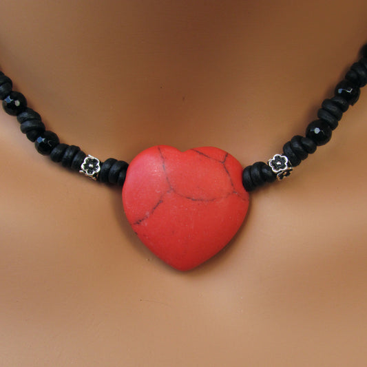 Red Gemstone Heart Choker Leather Necklace