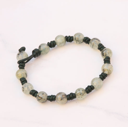 natural Prehnite gemstone on hand knotted leather bracelet