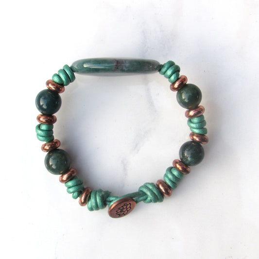 Natural Indian Agate gemstone and Copper Hand Knotted Leather Bracelet
