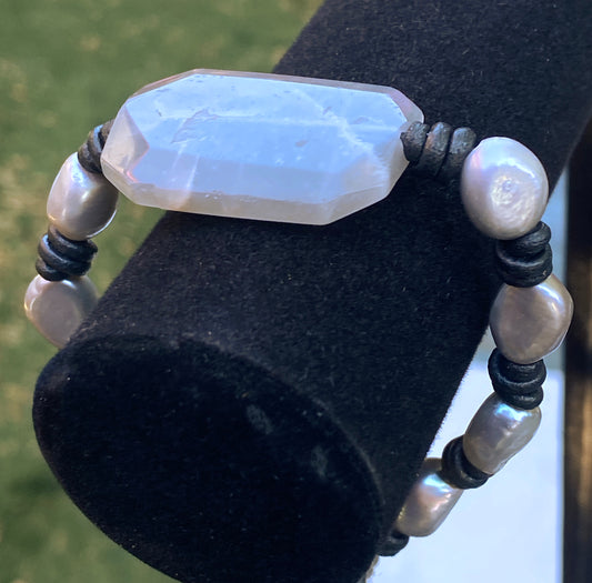Silver moonstone and genuine freshwater Pearl hand knotted leather bracelet