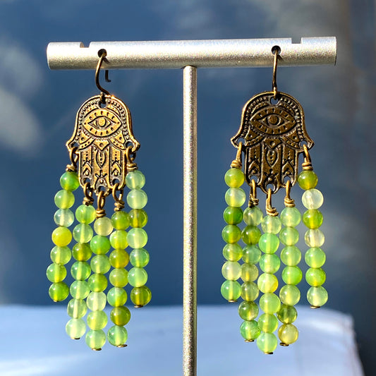 Green Agate gemstone and Copper Kitty Cat Drop Earrings