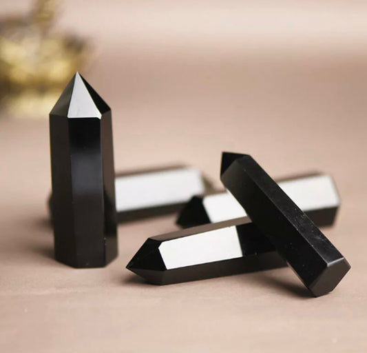 Natural Black Obsidian Quartz Obelisk Healing Crystal Point Wand Reiki