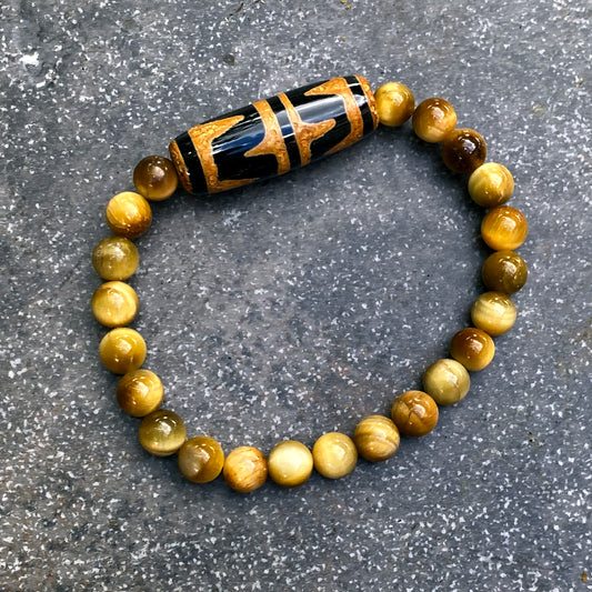 Golden Tiger’s Eye and Tibetan Agate gemstone Beaded Stretch Bracelet