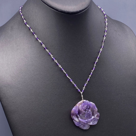 Amethyst Rose Pendant on Beaded Chain