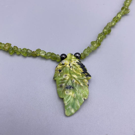 Chrysoprase gemstone carved Leaf with Peridot gemstone Beaded Necklace