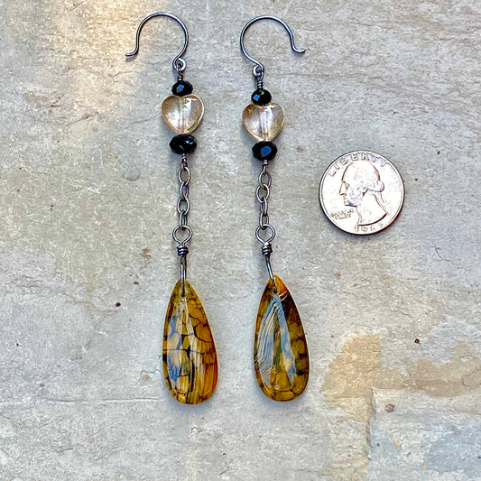 Citrine Hearts, Yellow Dragon’s Vein Agate, Black Spinel, and Oxidized Sterling Drop Earrings