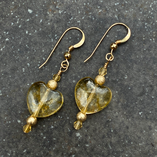 Citrine quartz Gemstone hearts and 14 kt gold fill drop earrings