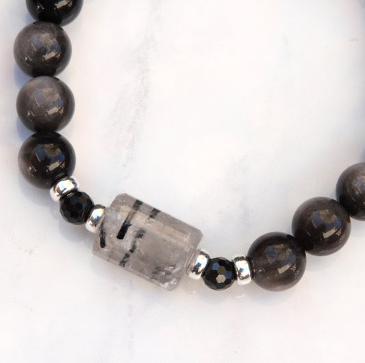Silver Obsidian, Black Spinel gemstone, Sterling Silver, Howlite Skull, and Tourmaline Quartz Bracelet
