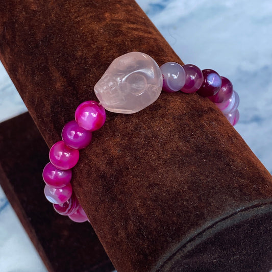 Pink Banded Agate and Rose Quartz Skull Bracelet