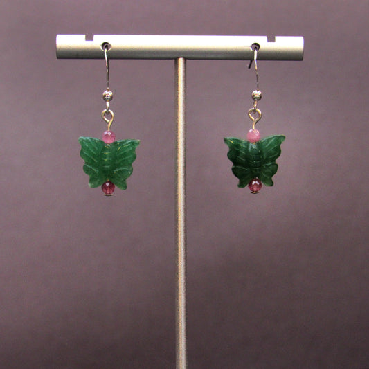 Green Aventurine butterflies, pink tourmaline, sterling silver drop earrings
