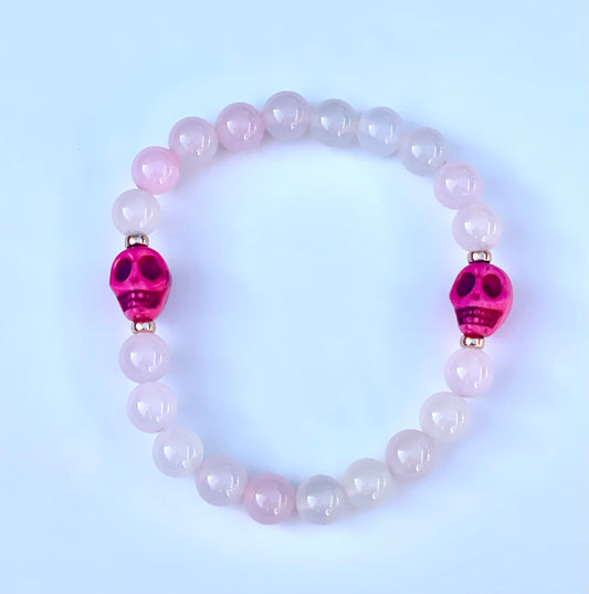 Pink Agate, pink Jade gemstone, and Howlite Skull bracelet
