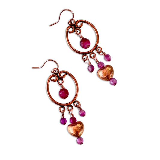 Pink agate gemstone wrapped copper Moon dangle earrings
