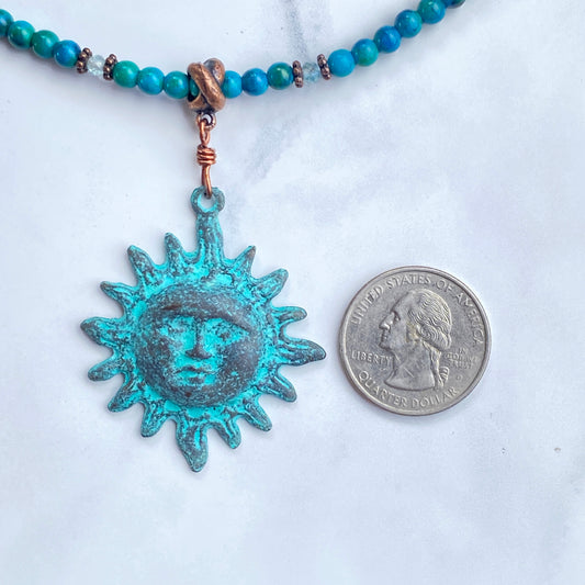 Natural Turquoise gemstone and copper Sun pendant beaded necklace