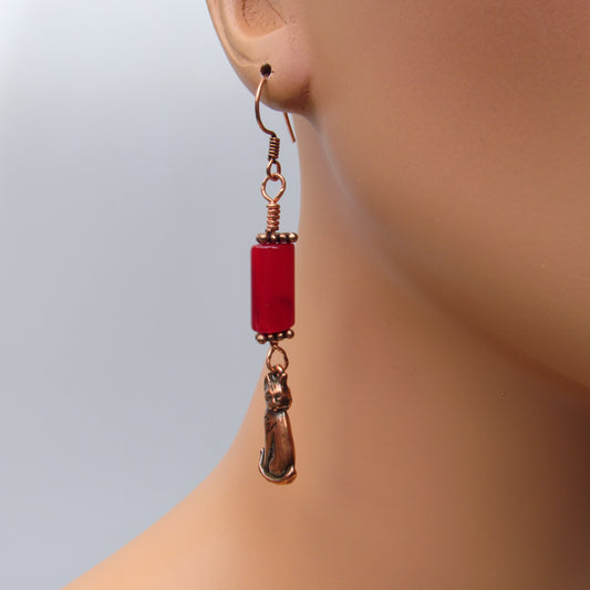 Red Agate gemstone and Copper Kitty Cat Drop Earrings