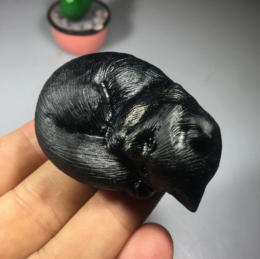 Black obsidian gemstone carved sleeping kitty cat