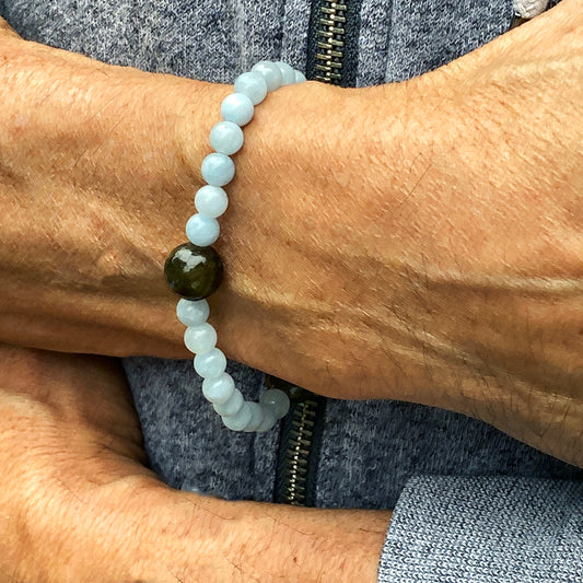 Men’s Aquamarine & black Labradorite semiprecious Gemstone stretch bracelet.