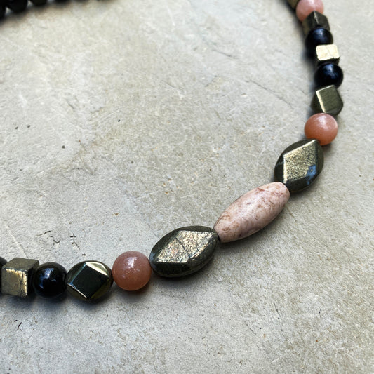 Men’s Coffee agate, sunstone, pyrite, gold obsidian necklace
