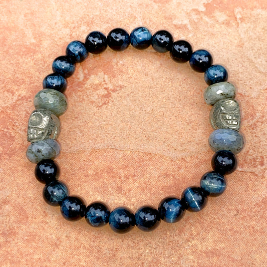 Men's Blue Tiger Eye Gemstone Bracelet with Labradorite and Pyrite Skulls