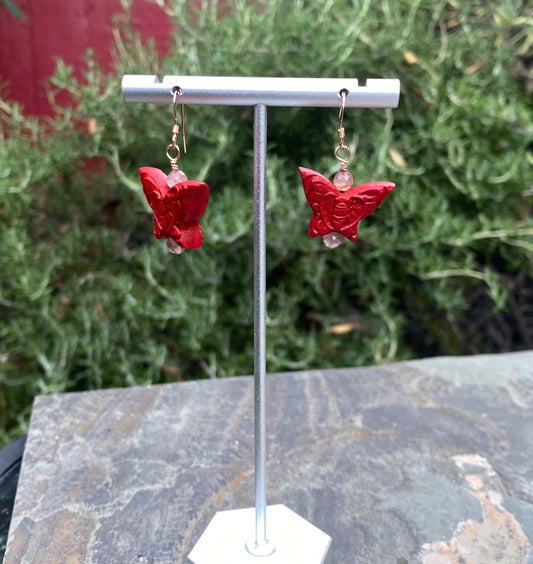Cinnabar butterfly and Lepidocrocite gemstone e/ 14 kt Rose GF drop earrings