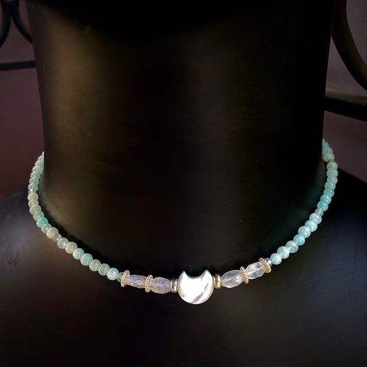 Mother of pearl moon with amazonite, moonstones, and apatite sterling silver Choker