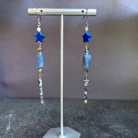Lapis Star, Hematite Star, Kyanite, and Aquamarine Gemstone Earrings