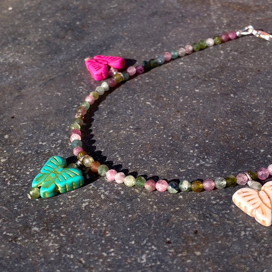Howlite butterfly and mixed tourmaline gemstone Sterling Silver anklet