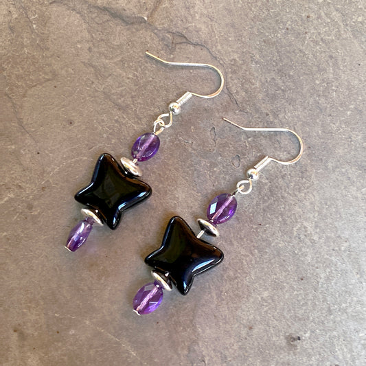 Black Obsidian Butterfly with Amethyst and Sterling Silver Drop Earrings