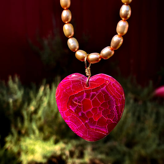 Pearl Necklace W/ Dragons Vein Agate Gemstone Heart