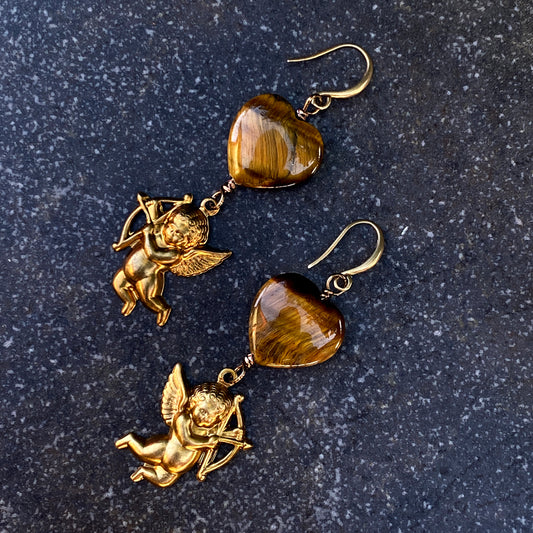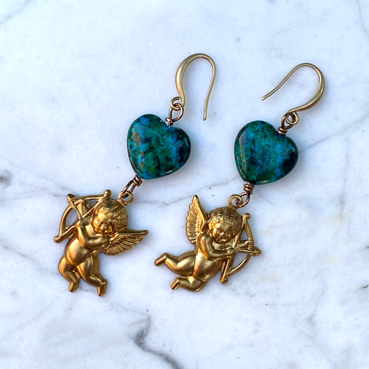 Garnet Gemstone hearts with Copper Circle with Cupid Imprint Dangle earrings