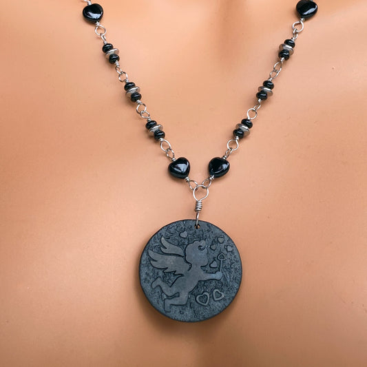 Carved Shungite Cupid Angel on Sterling Silver Chain with Onyx Gemstones