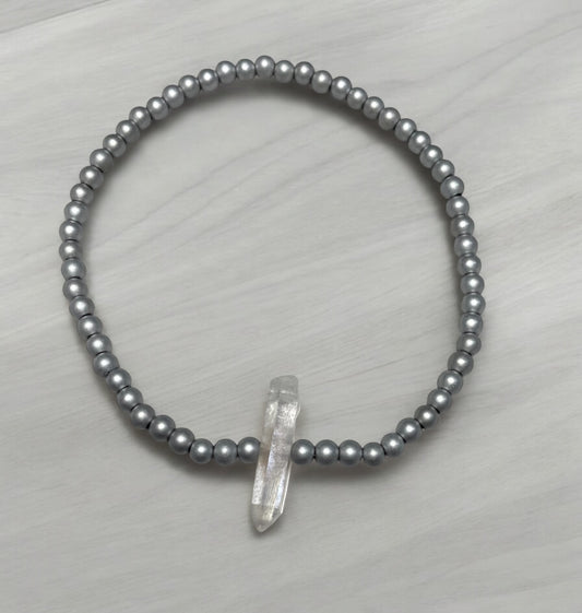 Dainty matte silver Hematite and Quartz gemstone Beaded Stretch Bracelet