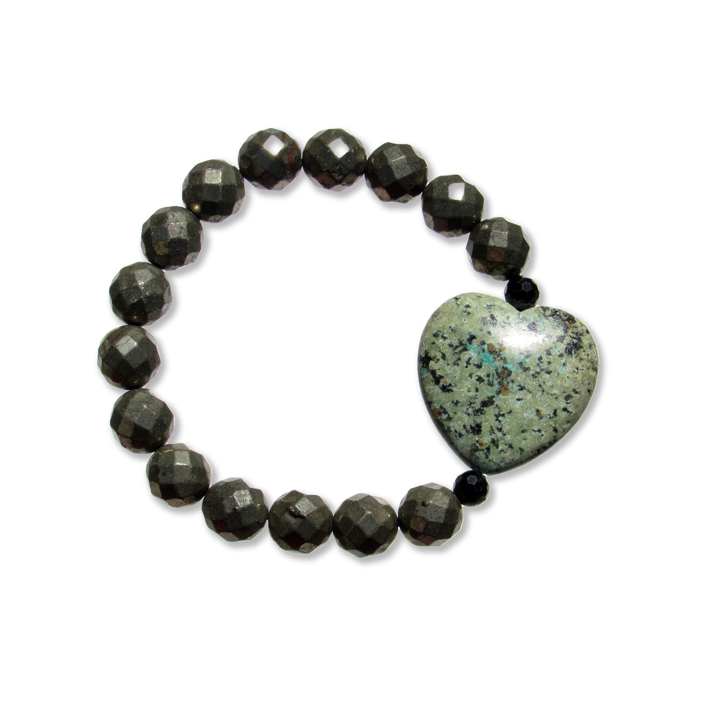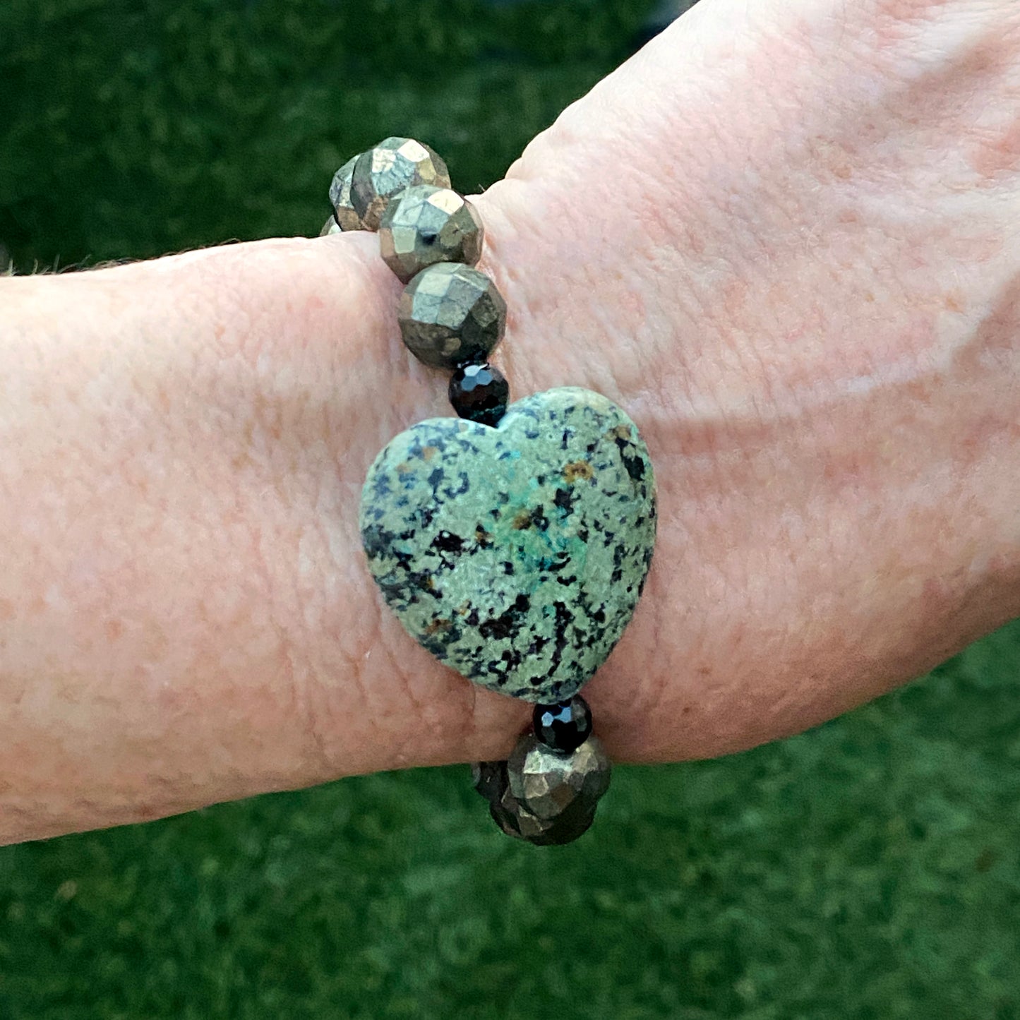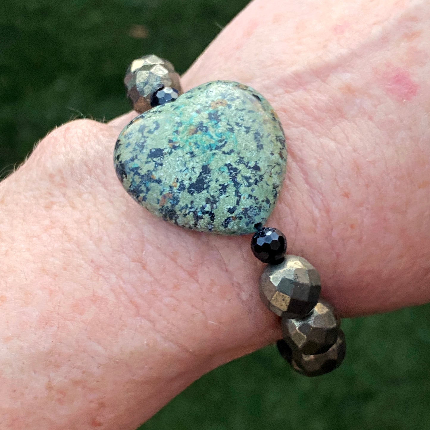 African Turquoise gemstone heart, Pyrite, and Black Spinel bracelet