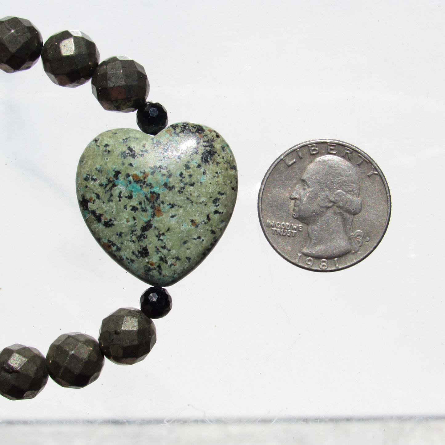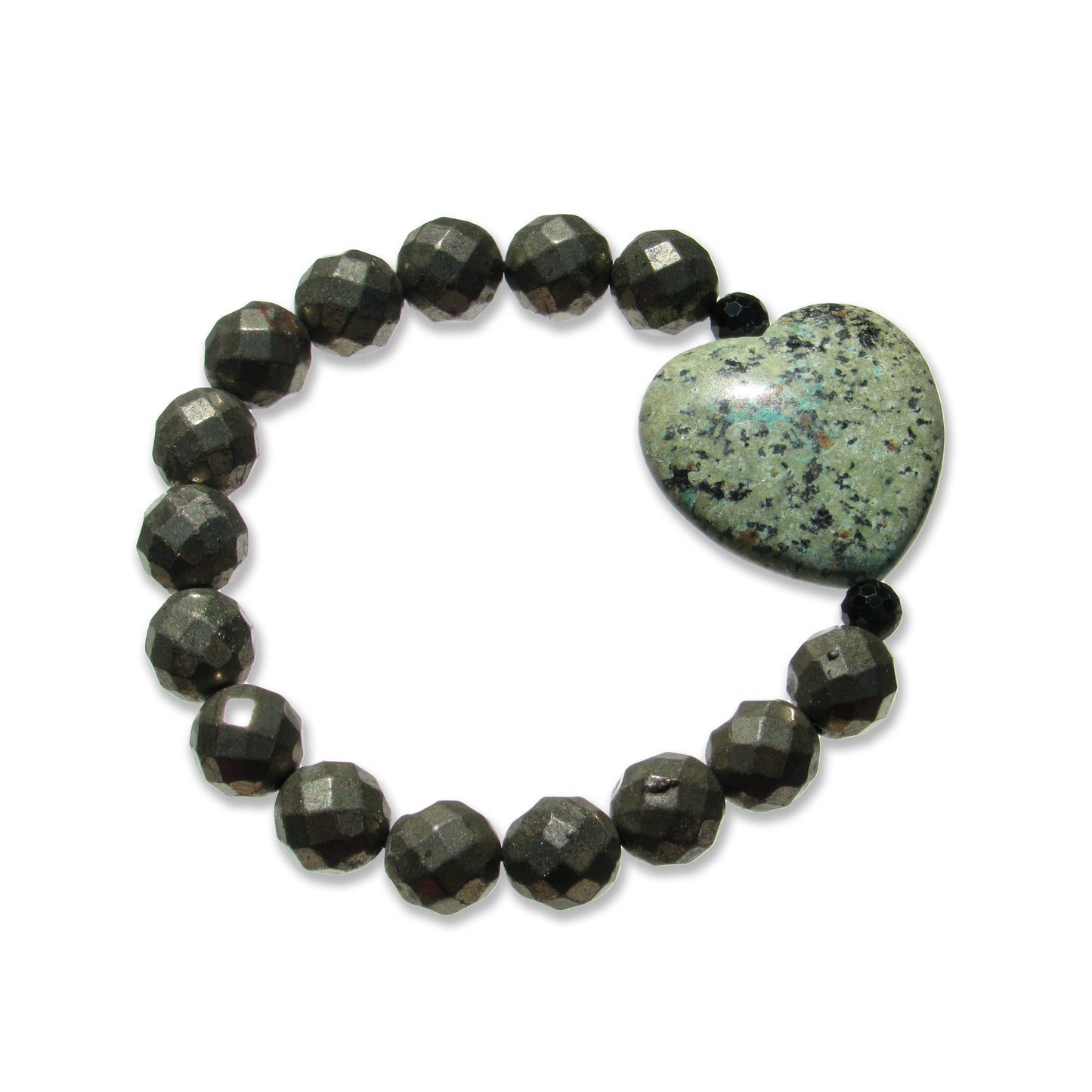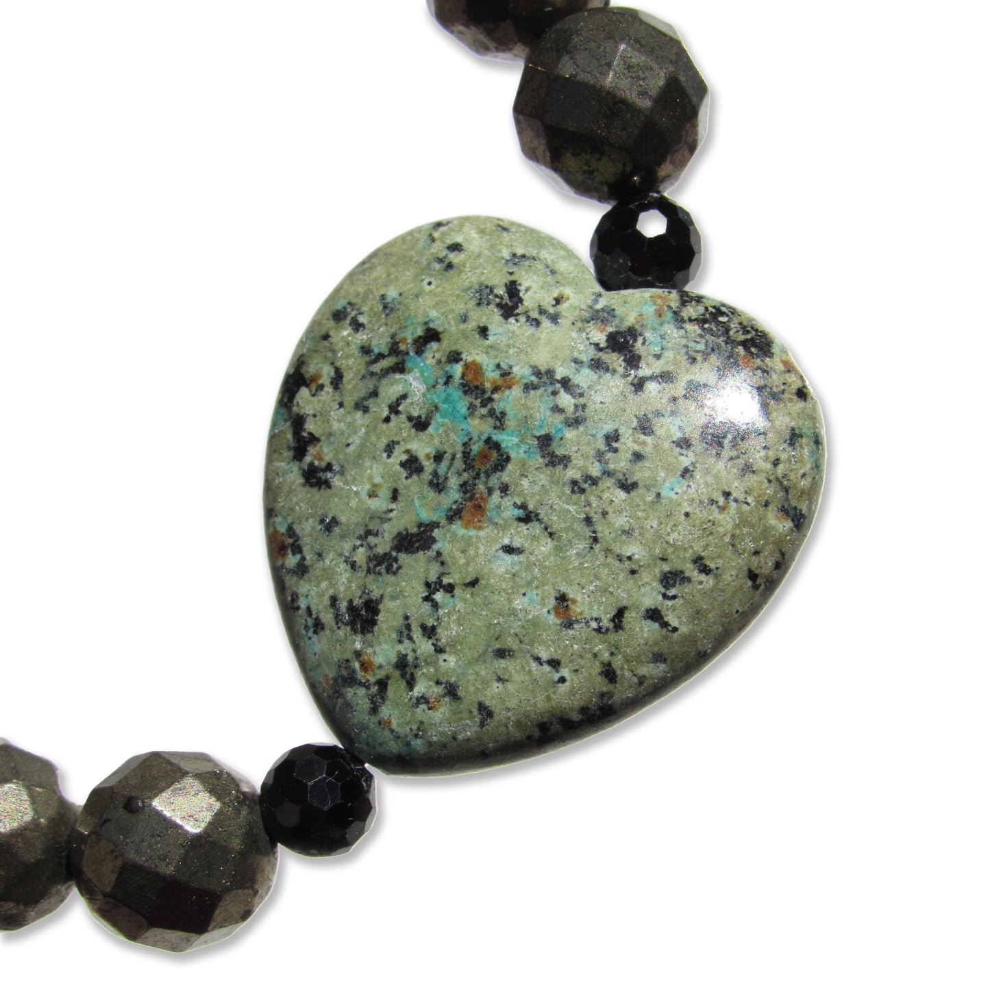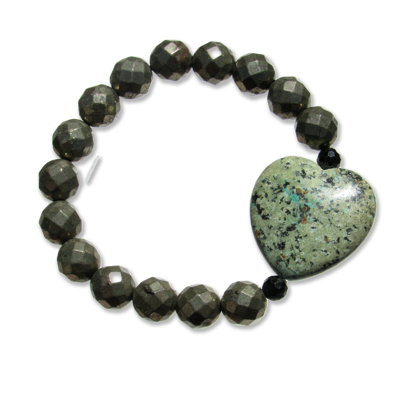 African Turquoise gemstone heart, Pyrite, and Black Spinel bracelet