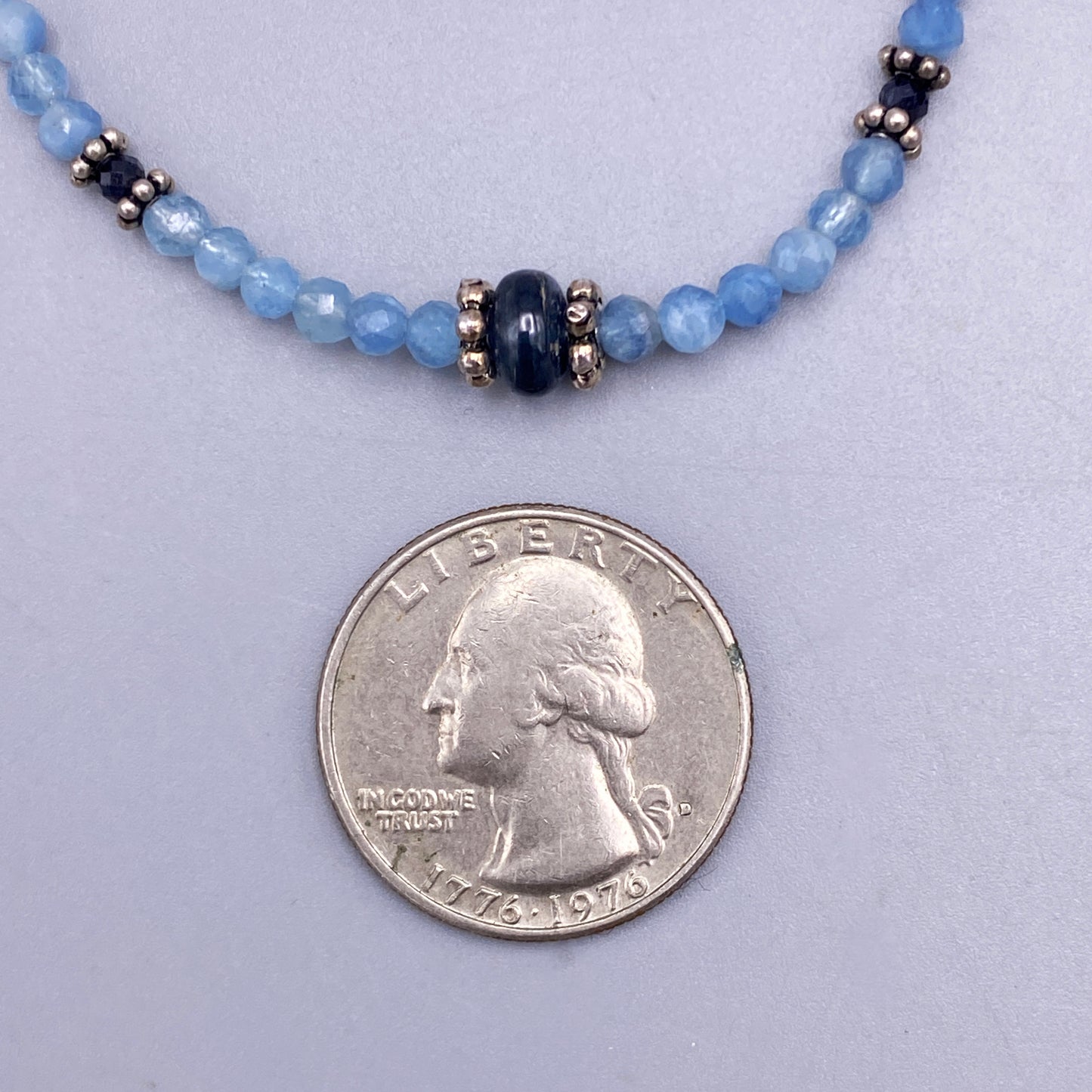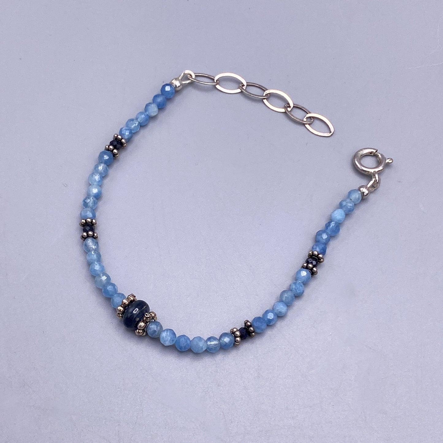 This bracelet features a silver clasp and genuine Aquamarine and Blue Sapphire gemstones. Aquamarine is the birthstone for March and Sapphire is the birthstone for September, making this piece a meaningful choice for those with birthdays in those months. The sapphire is certified genuine, adding value and authenticity to the bracelet.