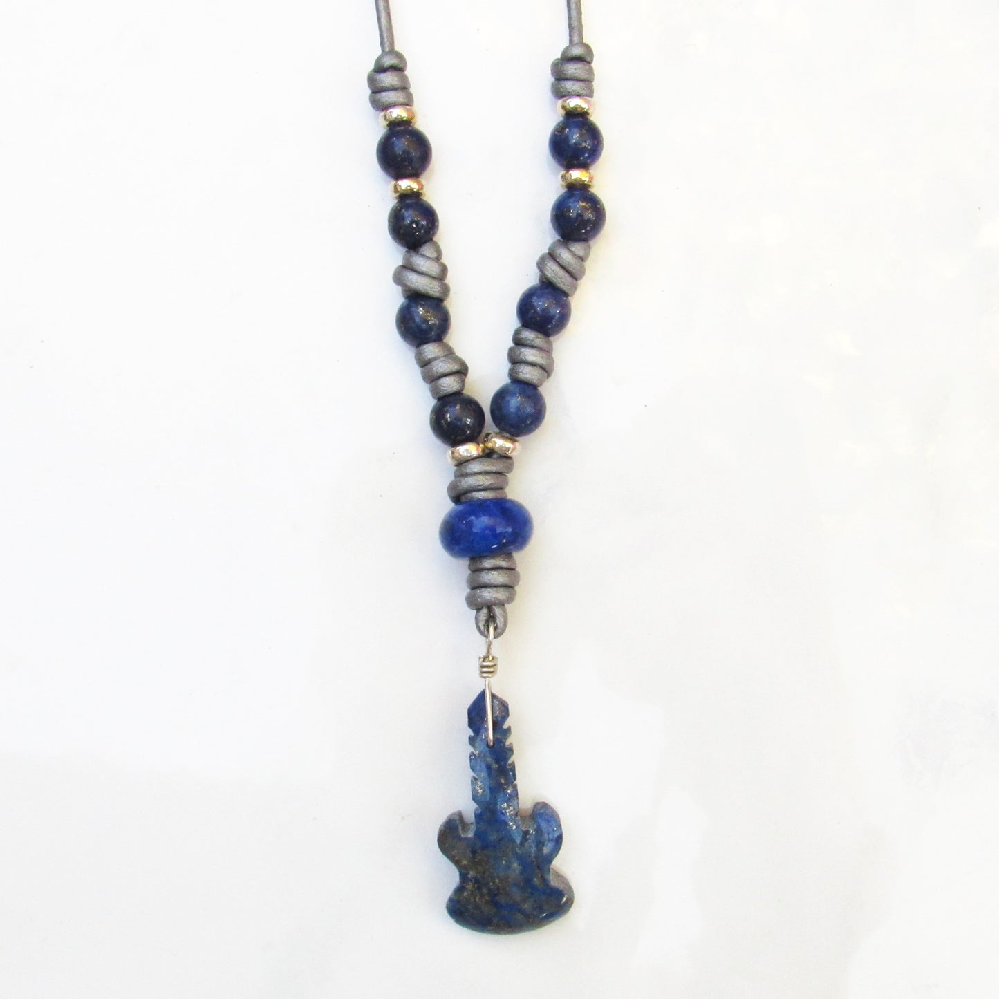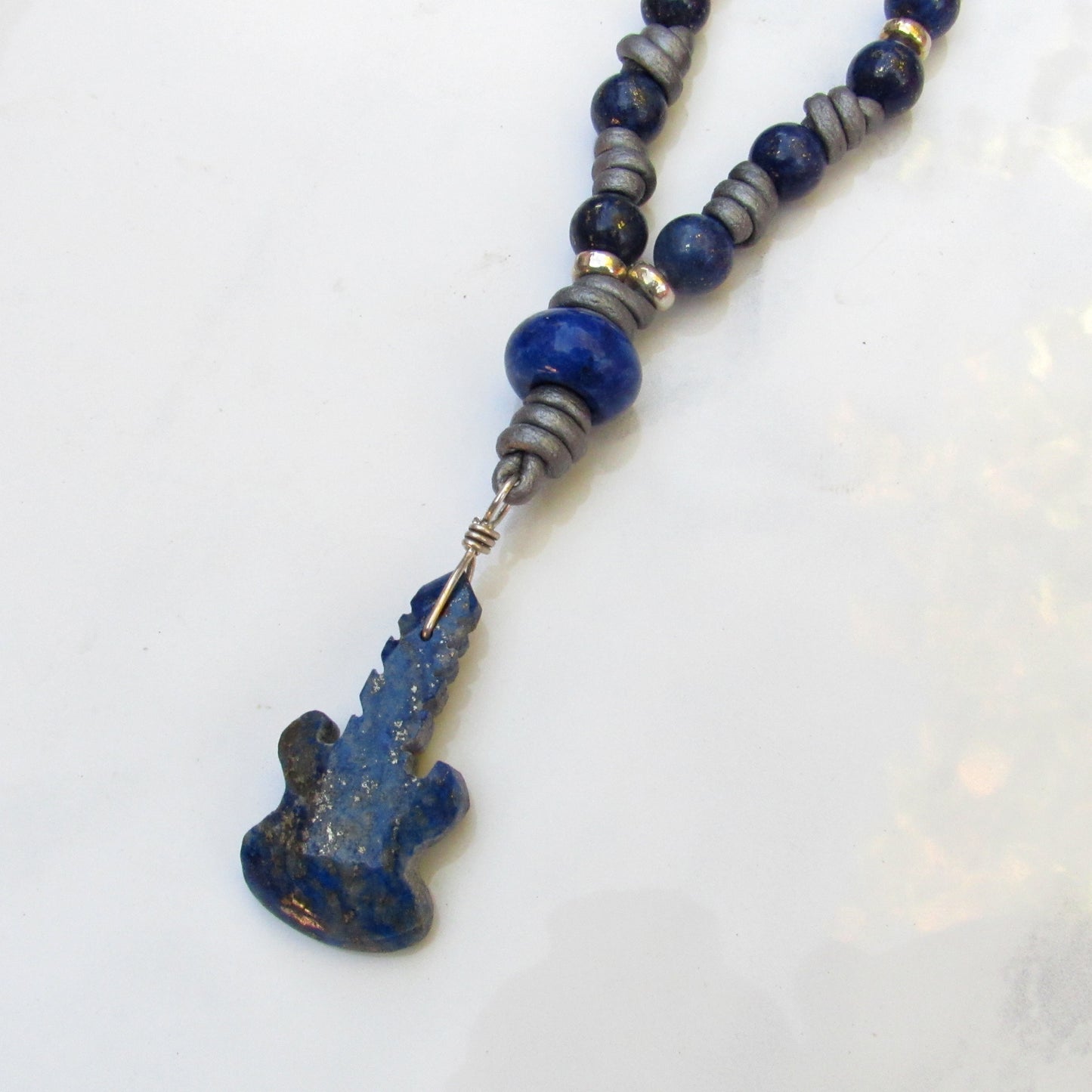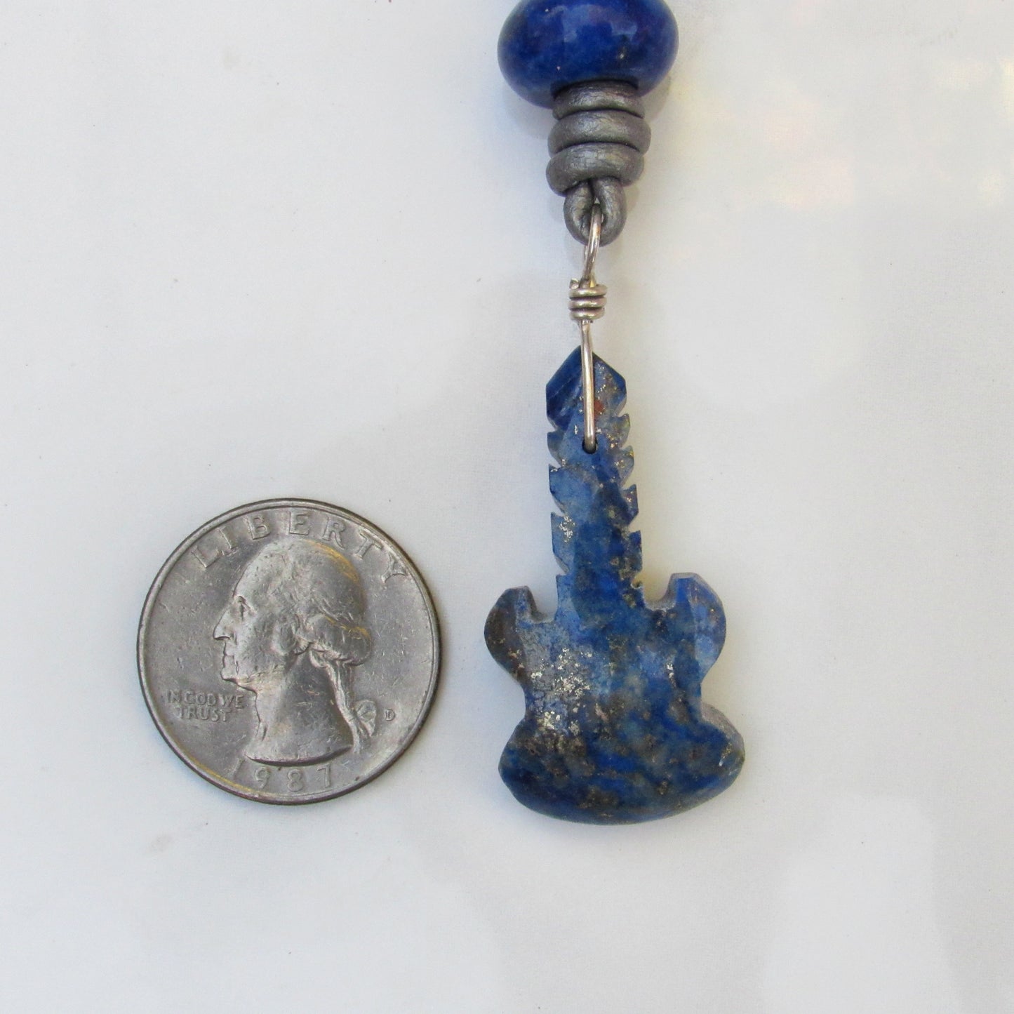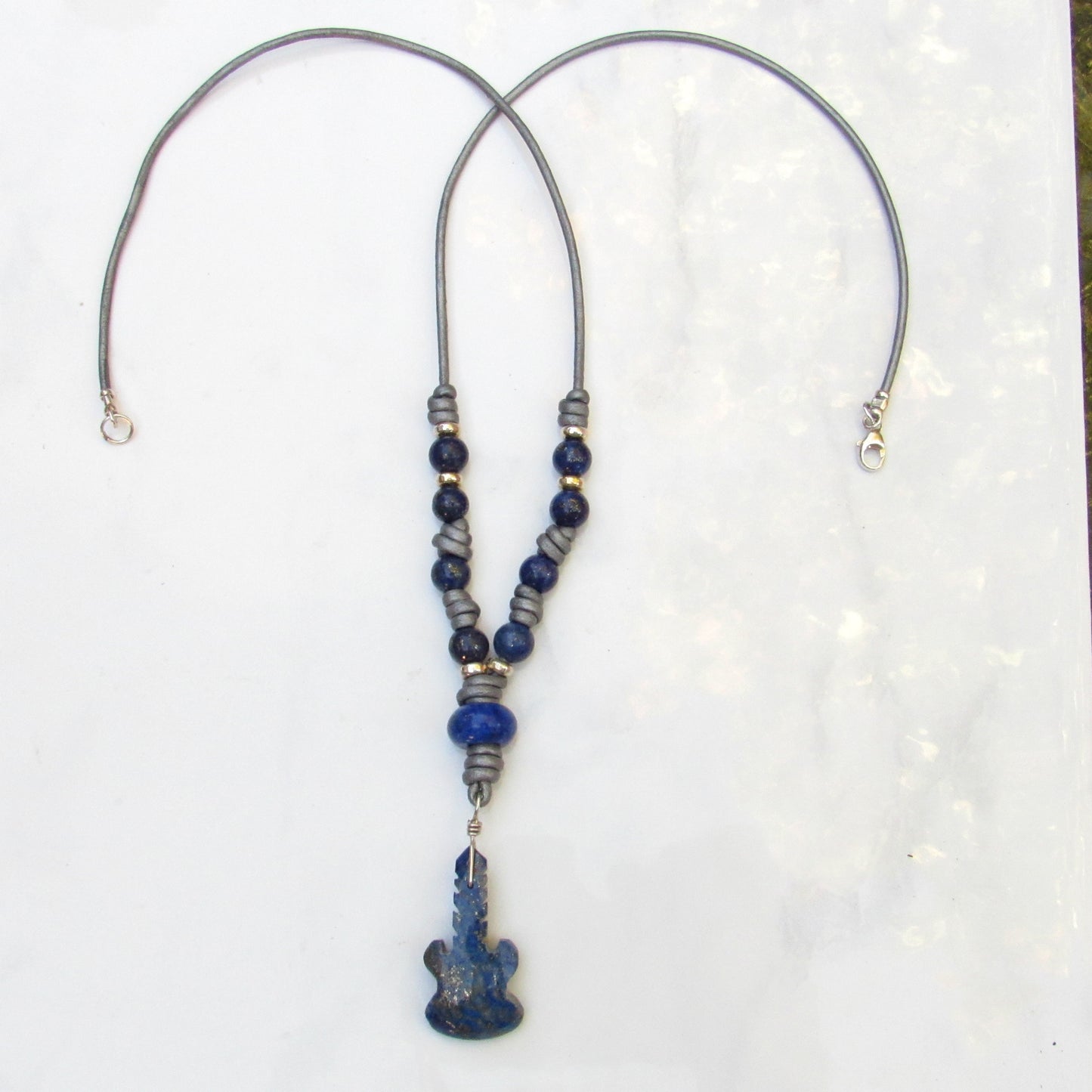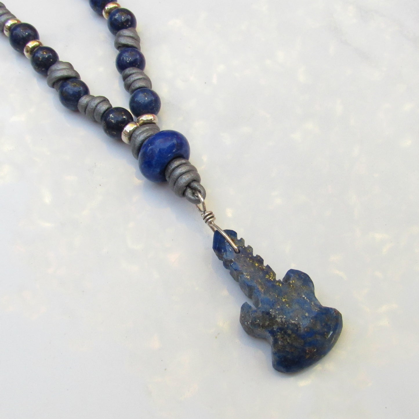 Blue Lapis Lazuli gemstone carved Guitar pendant Hand Knotted with Sterling Silver on Silver Leather, 24 inches long