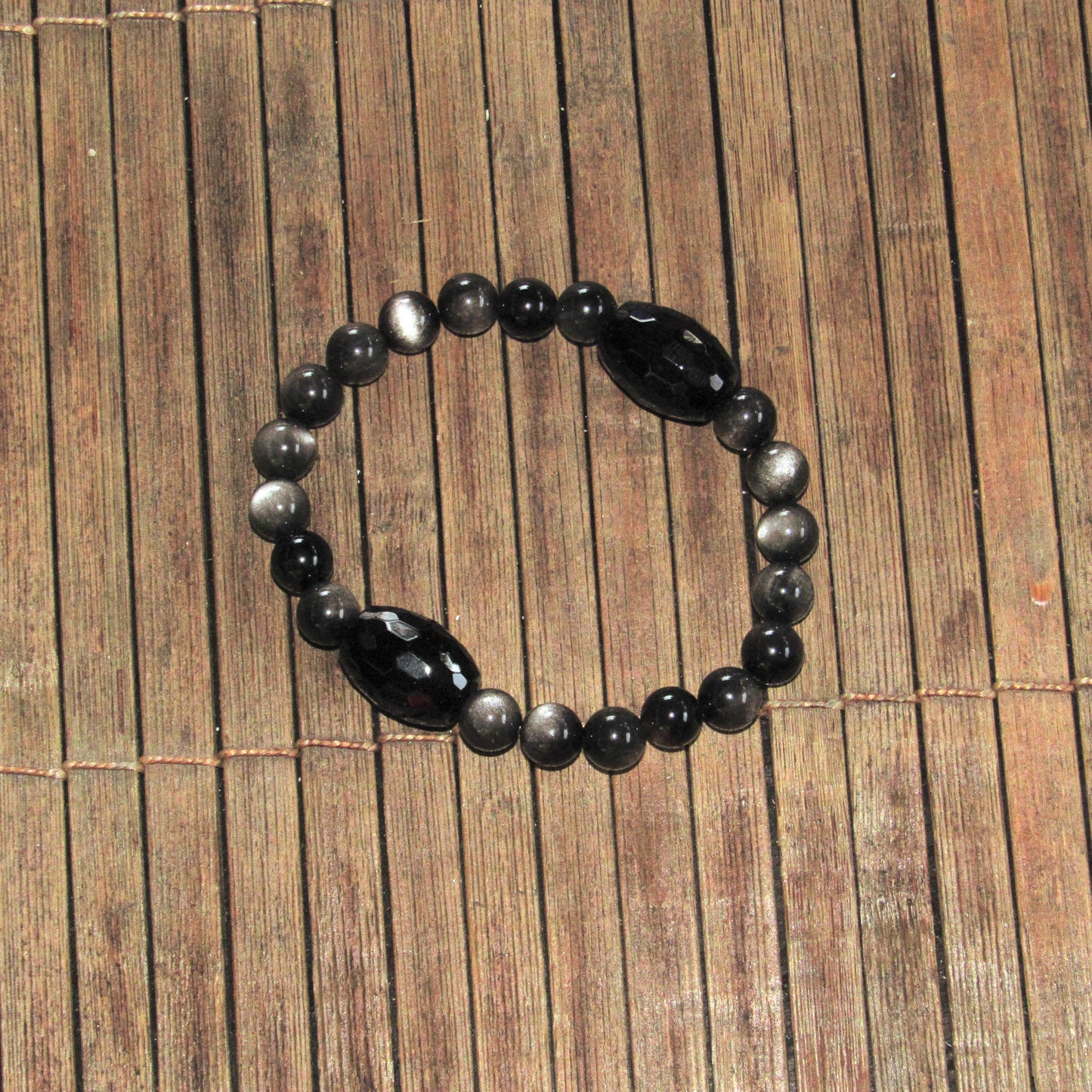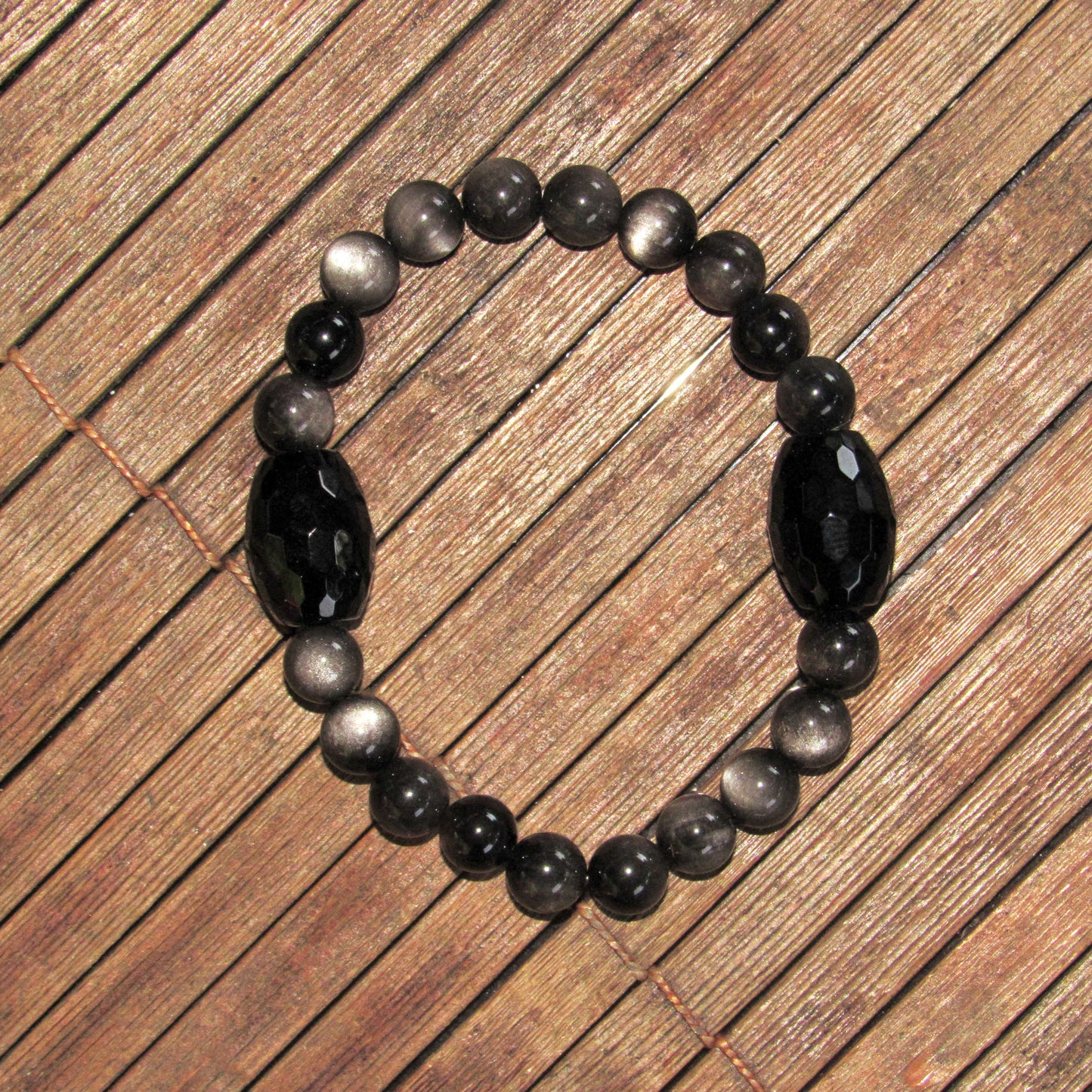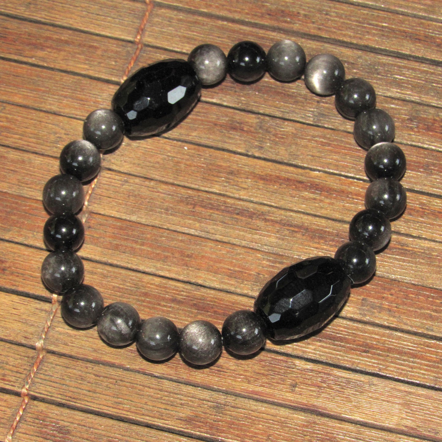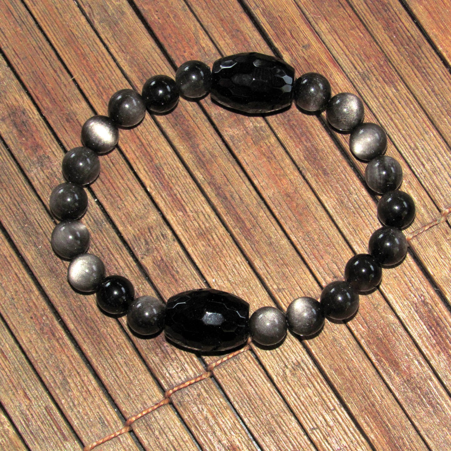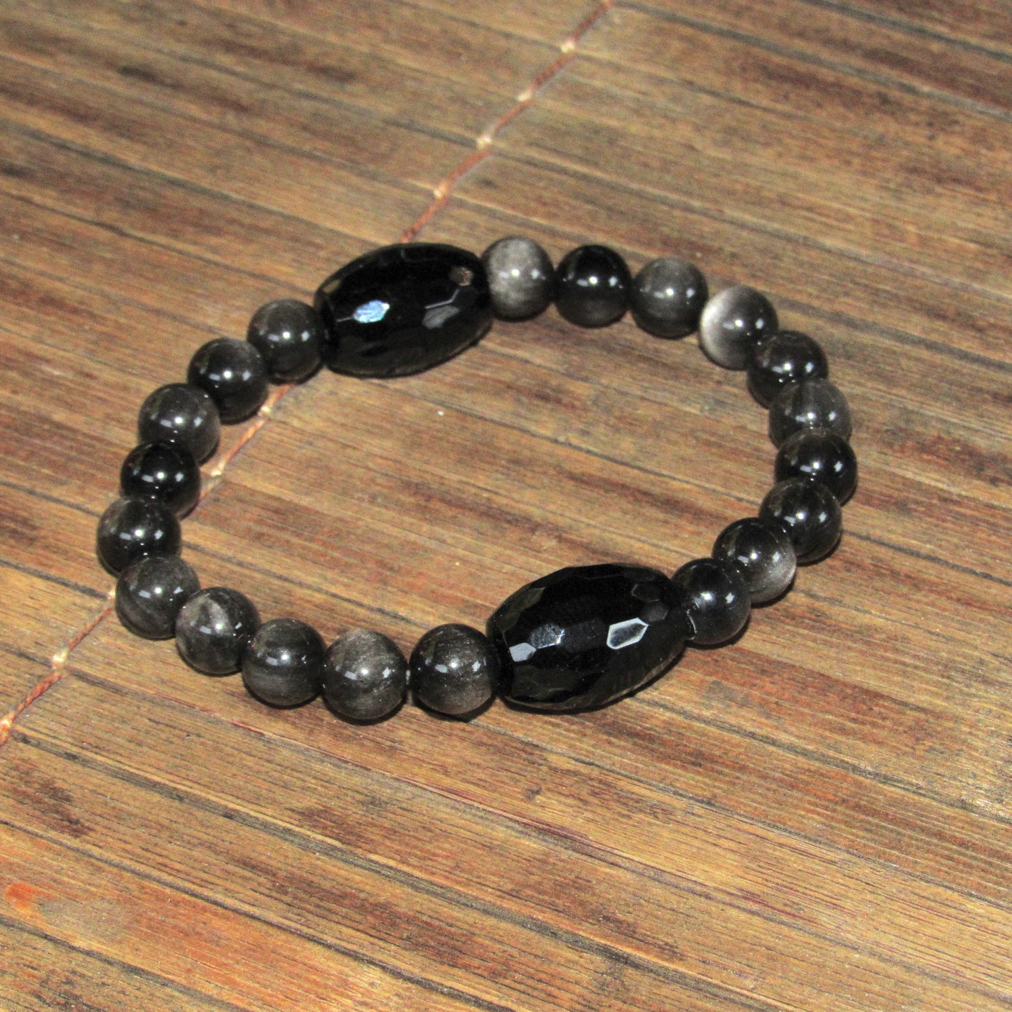 Chunky Black Onyx and Silver Obsidian Stretch Bracelet