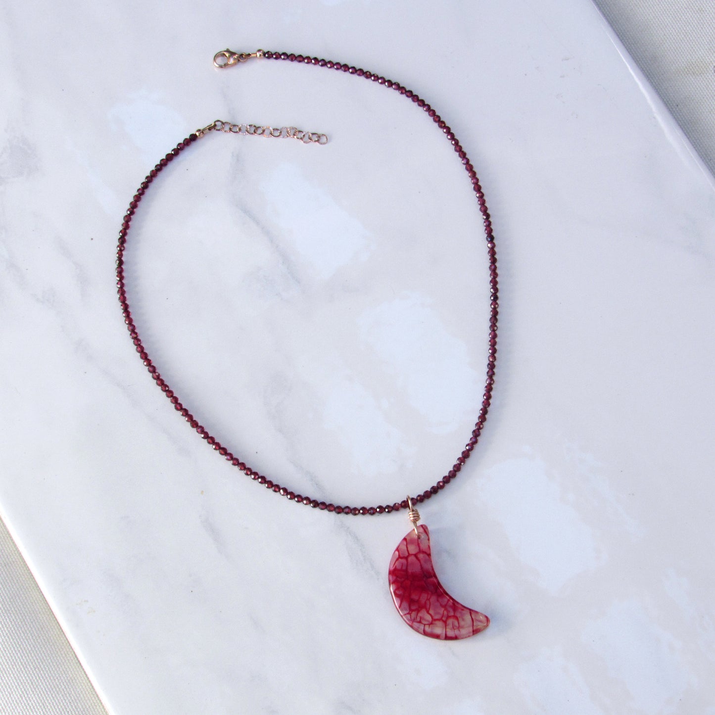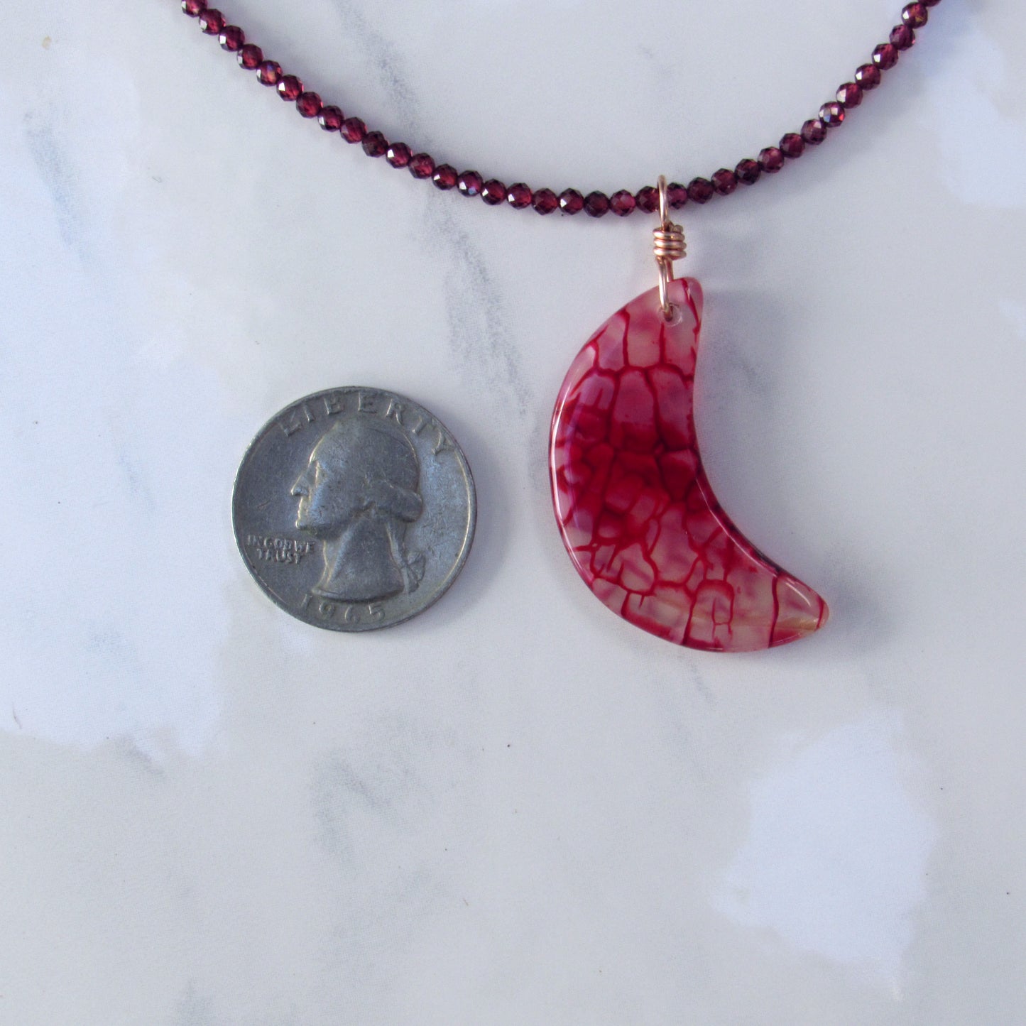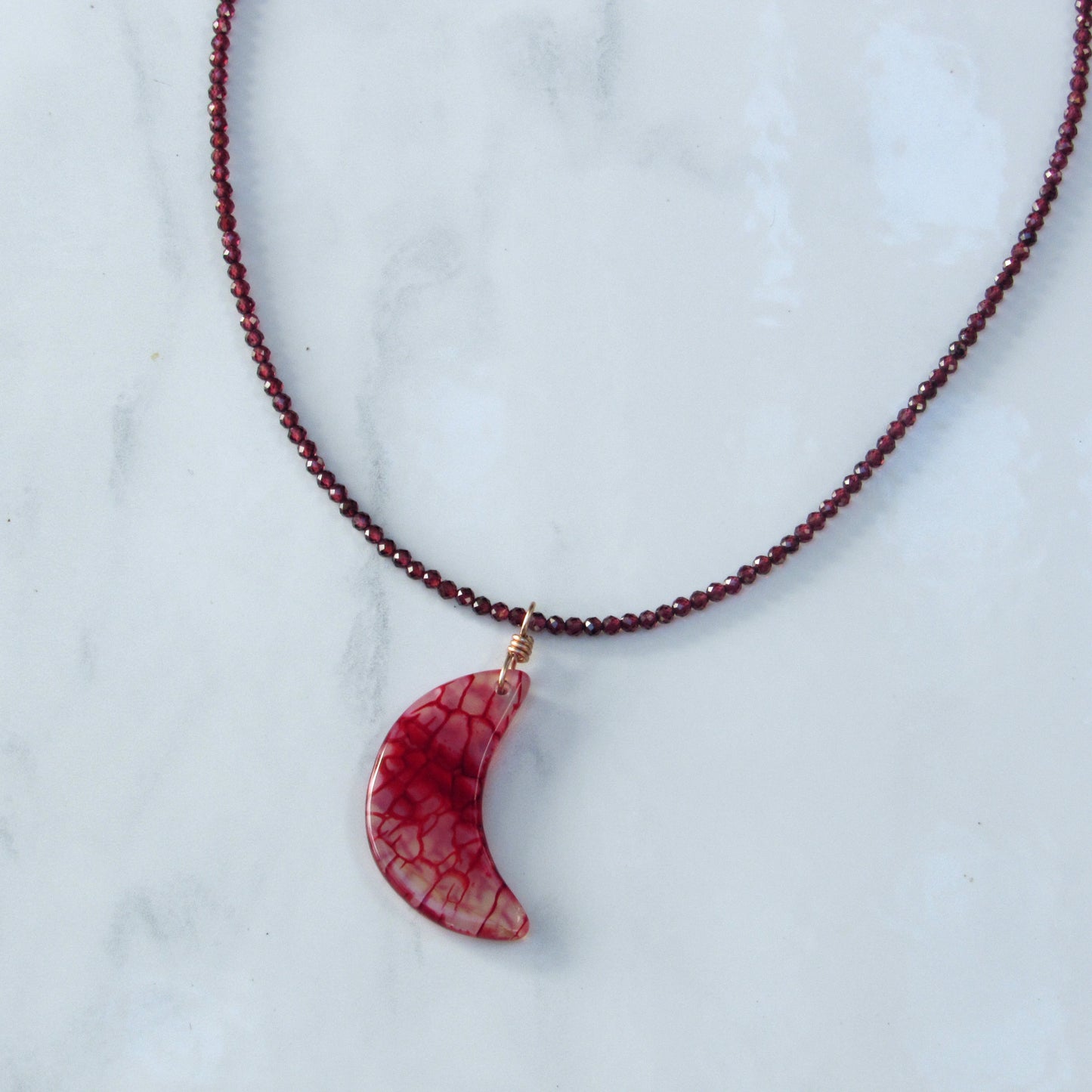 Dragon’s Vein’s Agate Moon Hand-wrapped Pendant w/ 14 Kt Rose Gold Filled on Garnets Beaded Necklace 16in in length with a 1.5in chain. 17.5in total length.