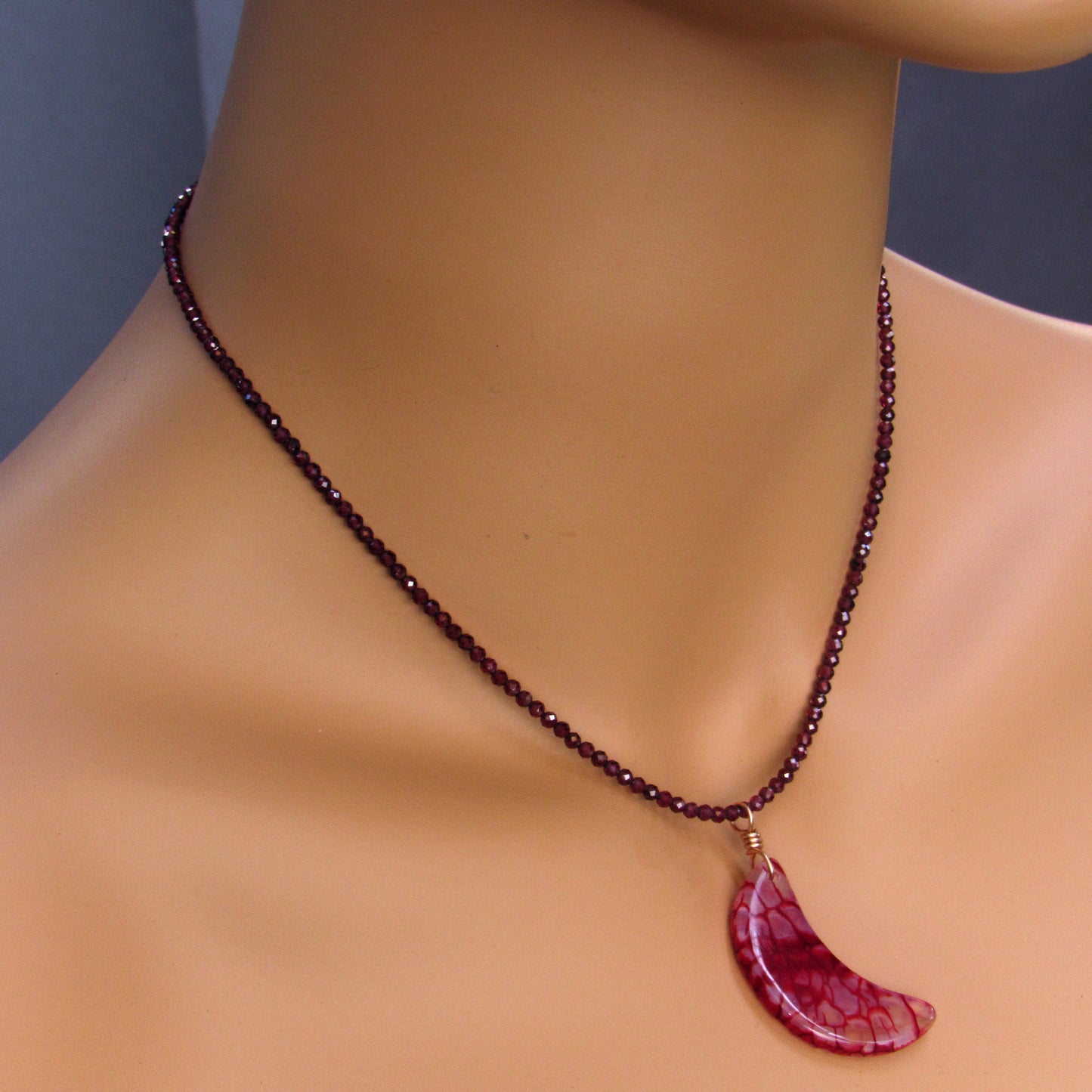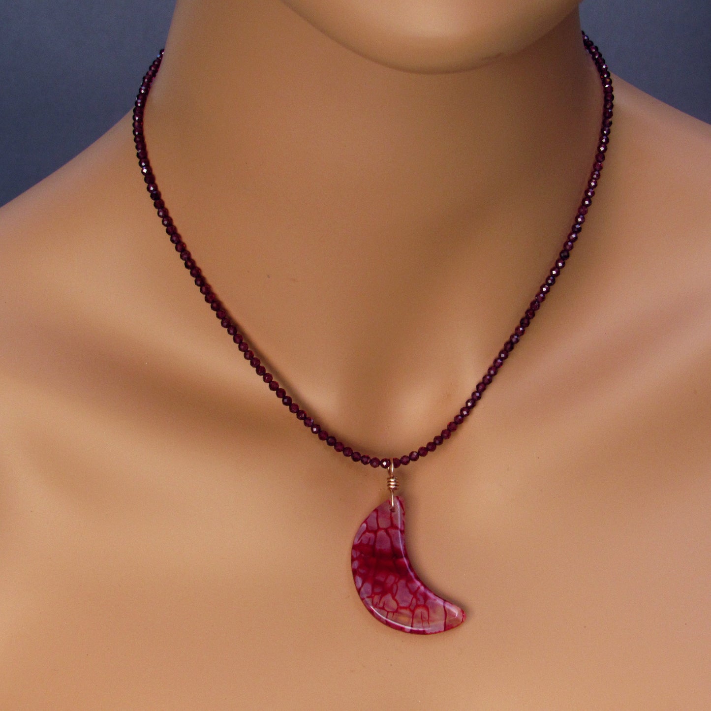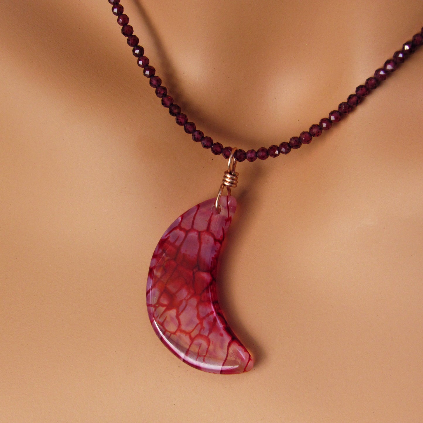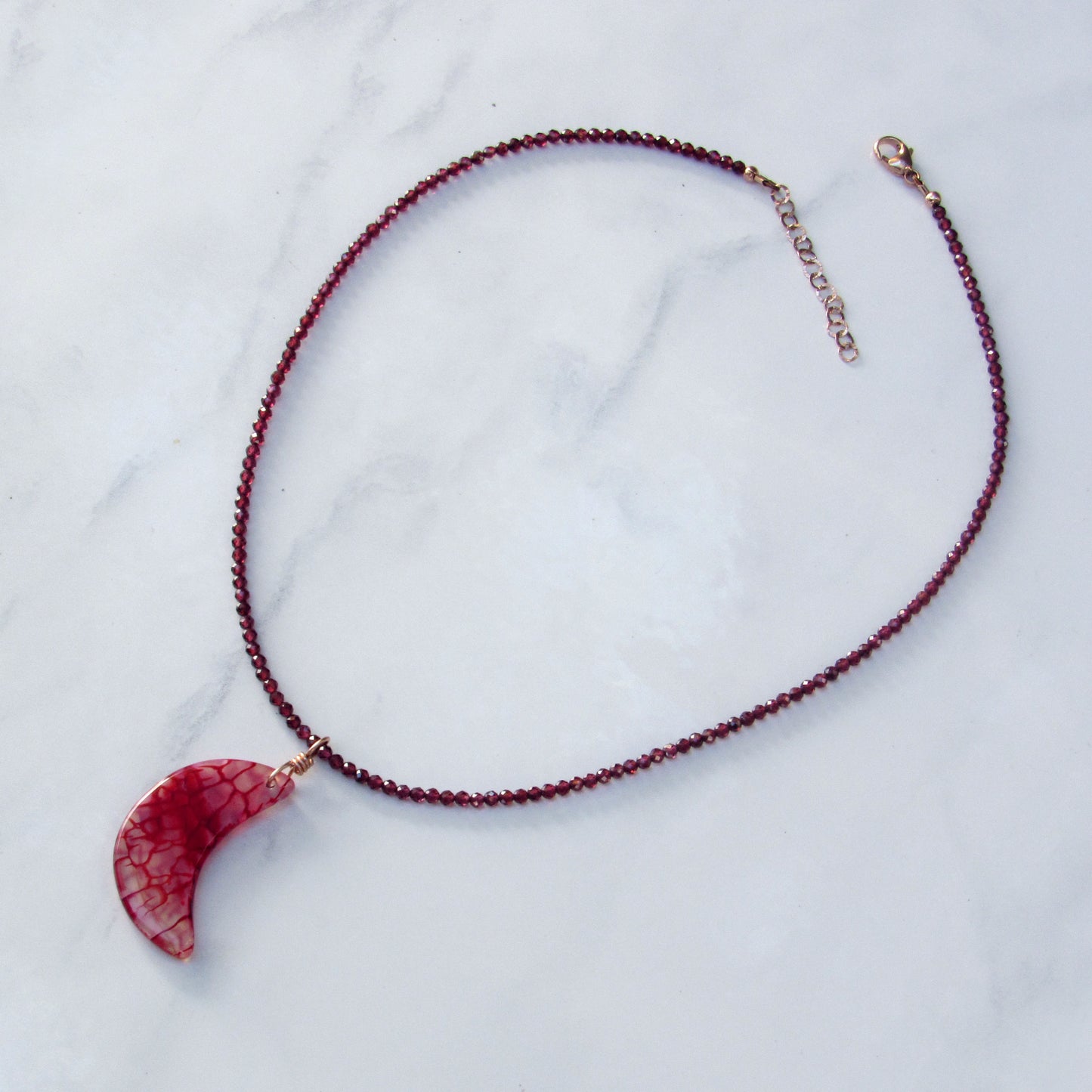 Dragon’s Vein’s Agate Moon Hand-wrapped Pendant w/ 14 Kt Rose Gold Filled on Garnets Beaded Necklace 16in in length with a 1.5in chain. 17.5in total length.