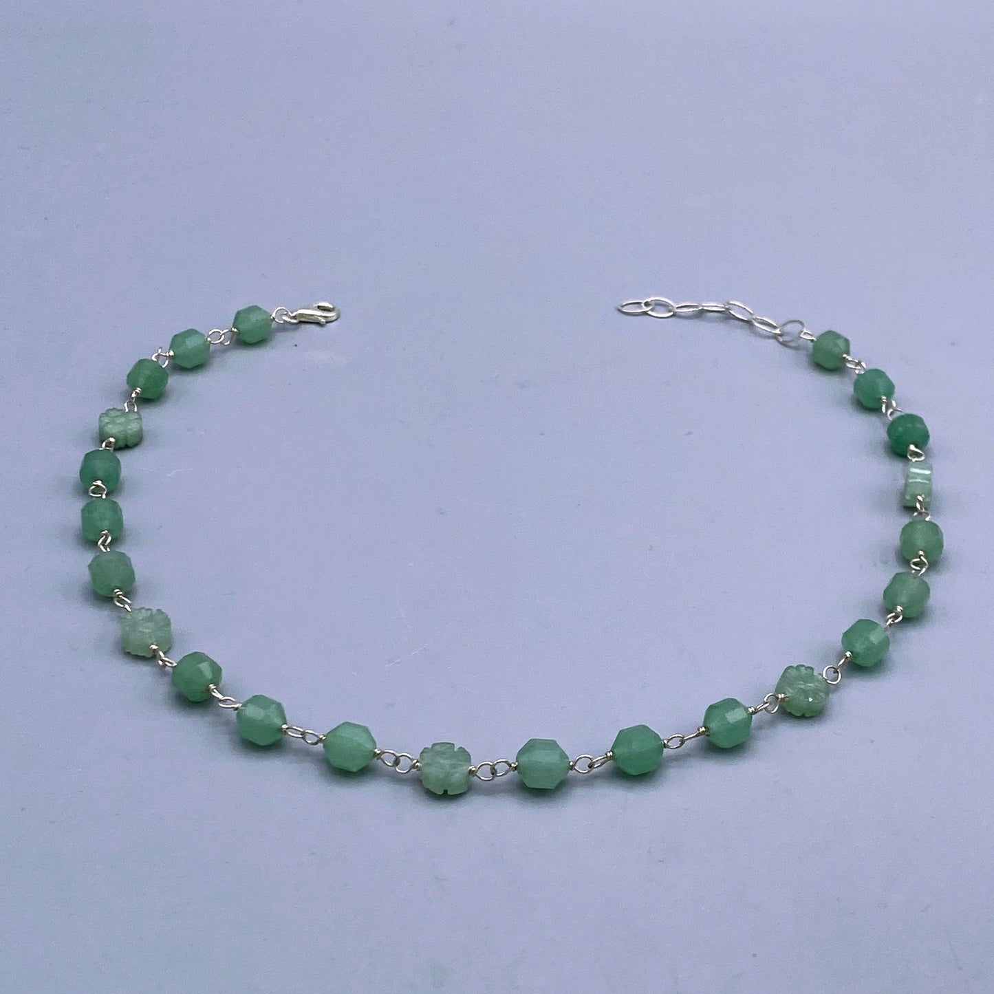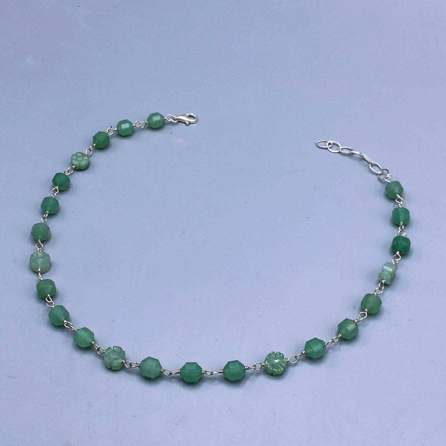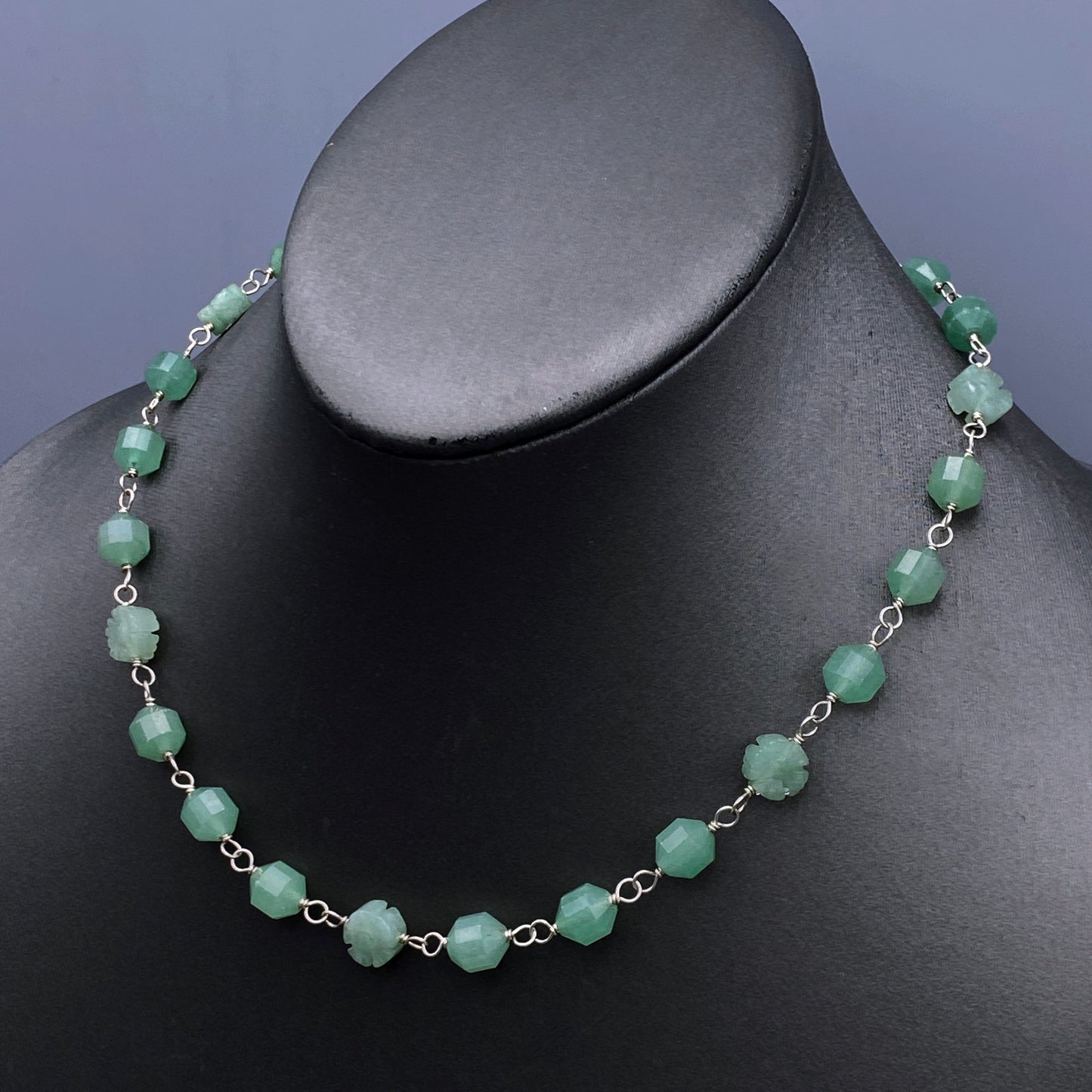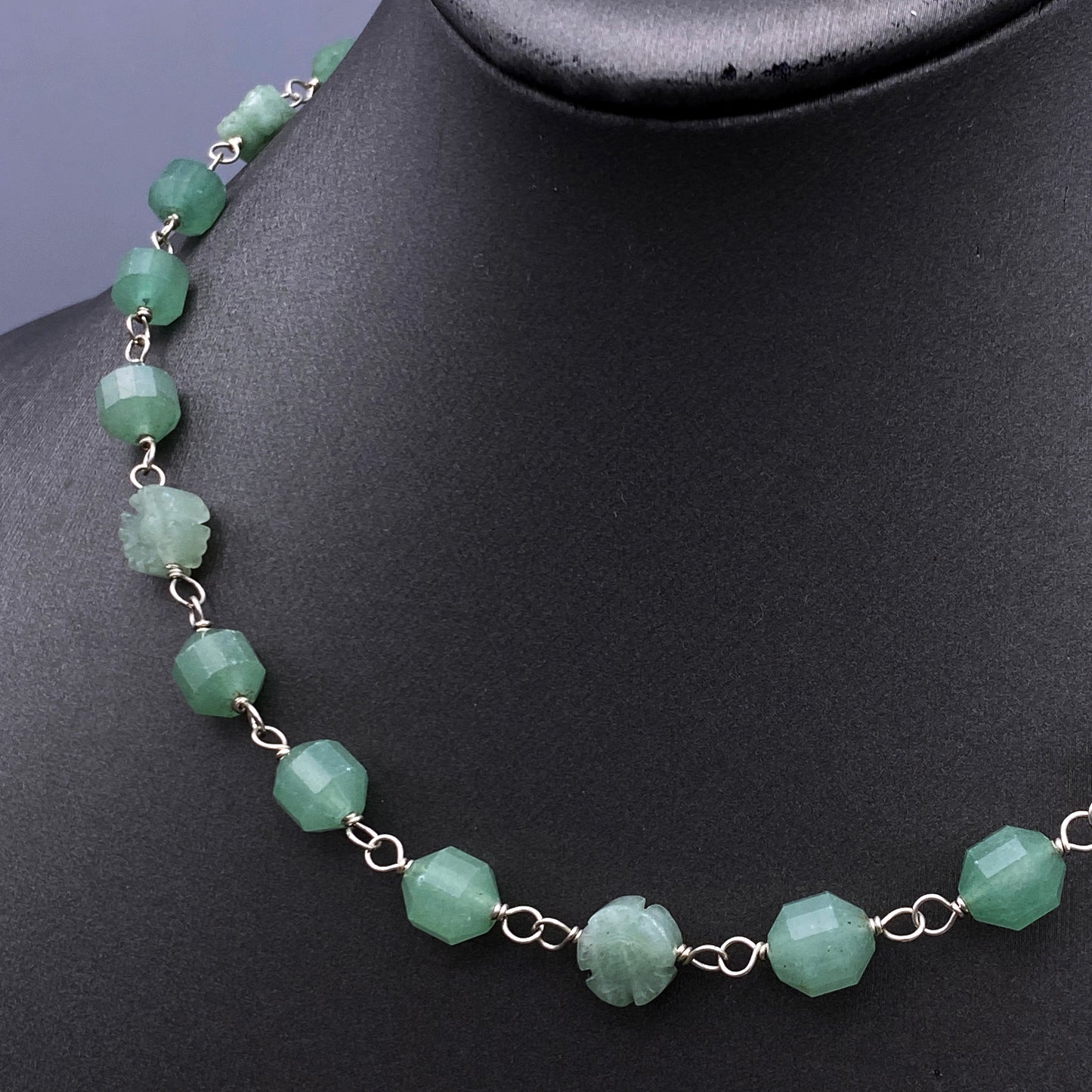 The Green Aventurine gemstone beads, measuring 8 mm, are paired with a 15.5" sterling silver chain, resulting in a total length of 17". The quality and authenticity of this necklace is guaranteed.