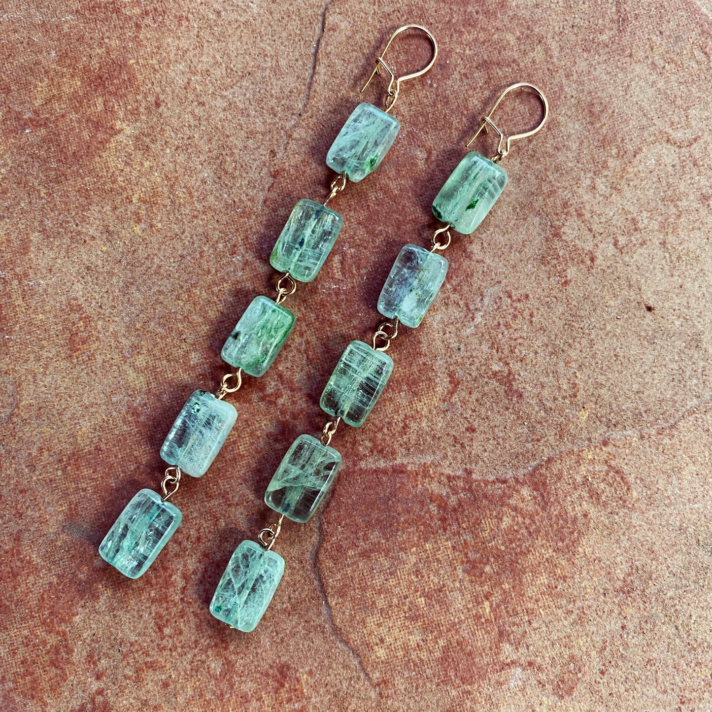 Green kyanite Gemstone and 14 kt gold filled long drop earrings