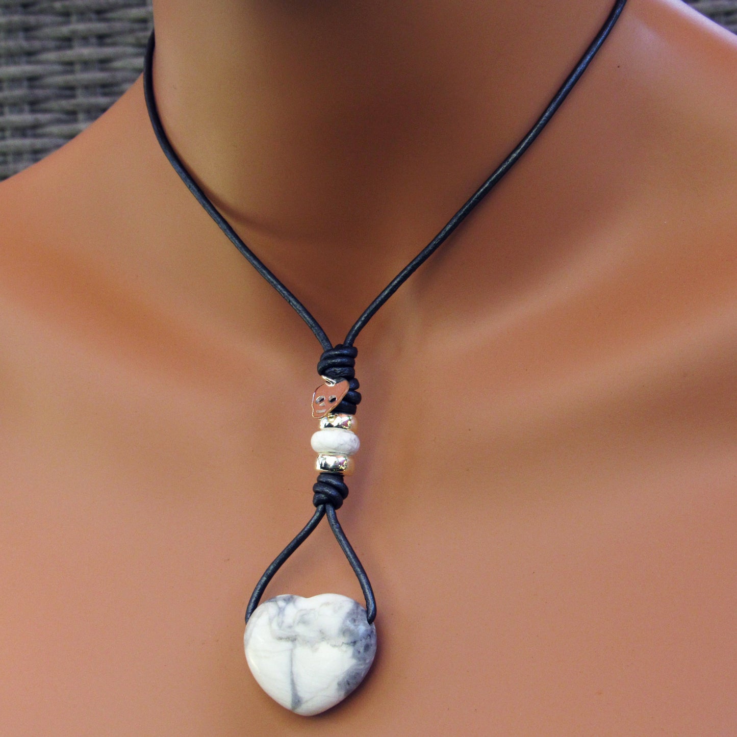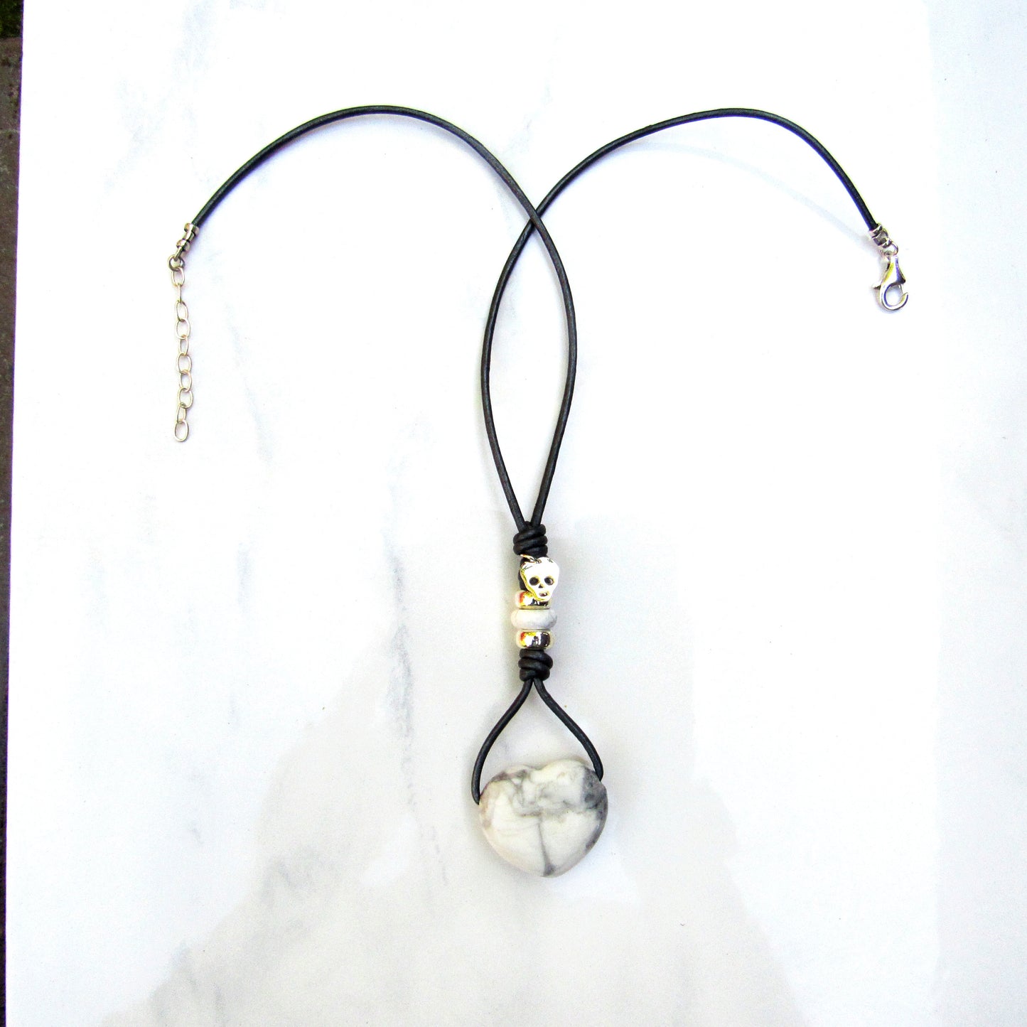 Howlite hand knotted leather with Sterling Silver Skull Necklace