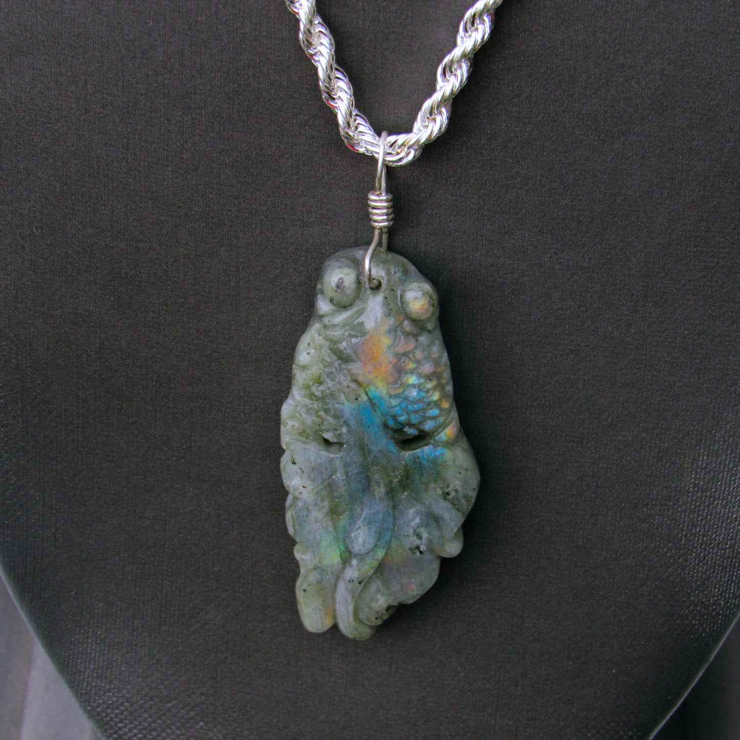 men’s or unisex beautiful necklace! Gorgeous gemstone fish hand wrapped with sterling silver on a sterling silver chain.