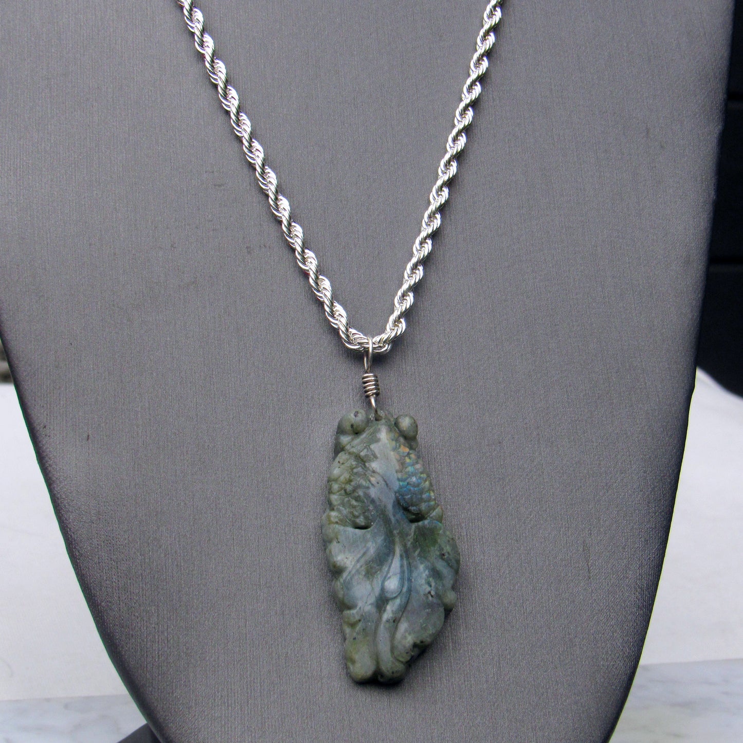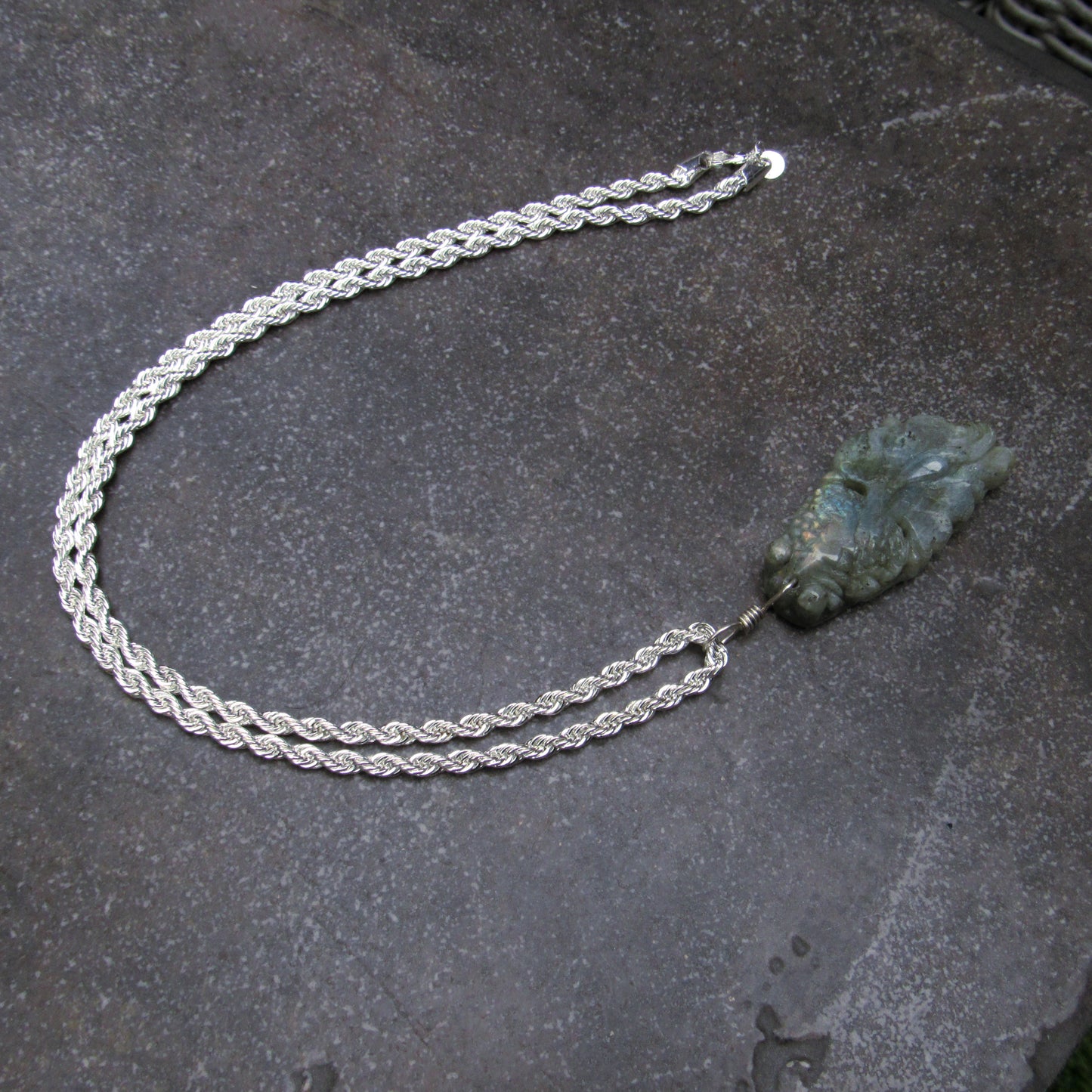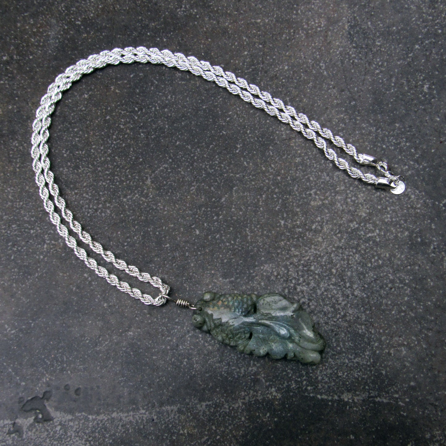 Labradorite gemstone carved Fish on Sterling Silver chain.