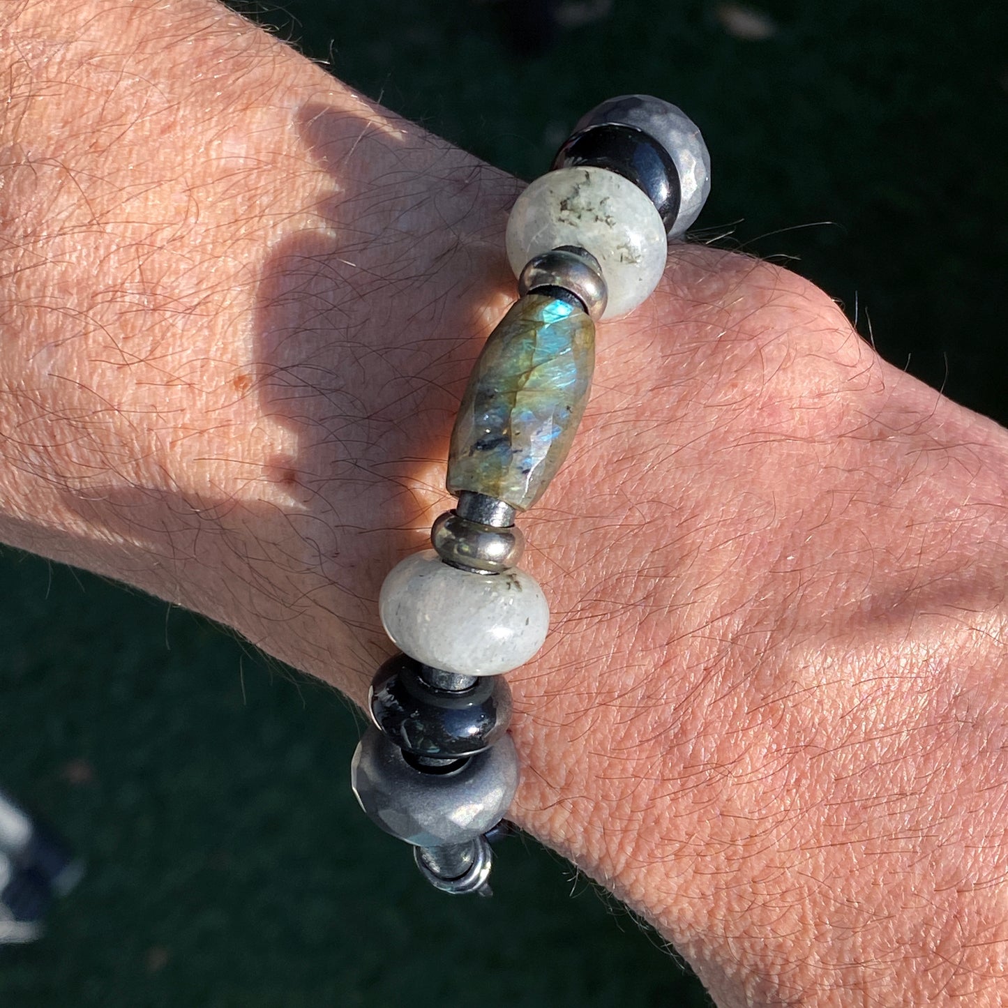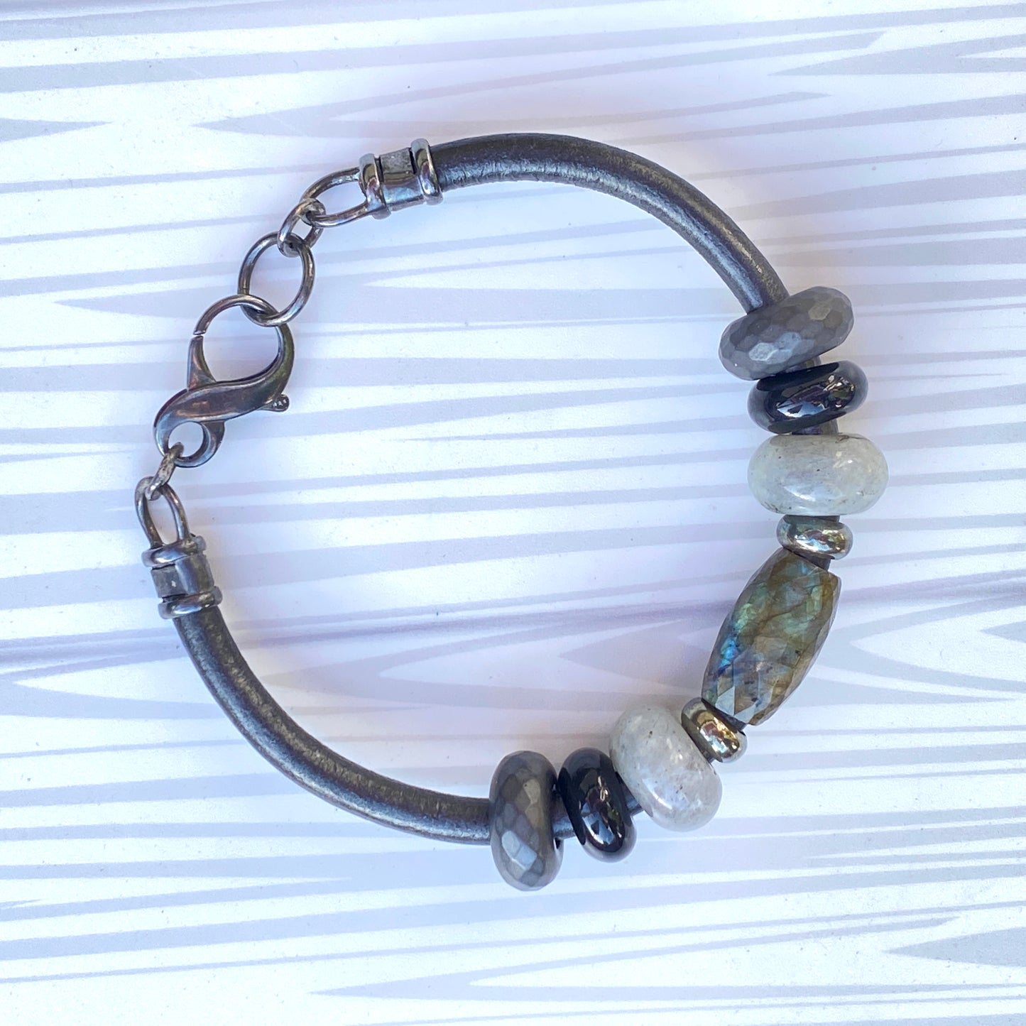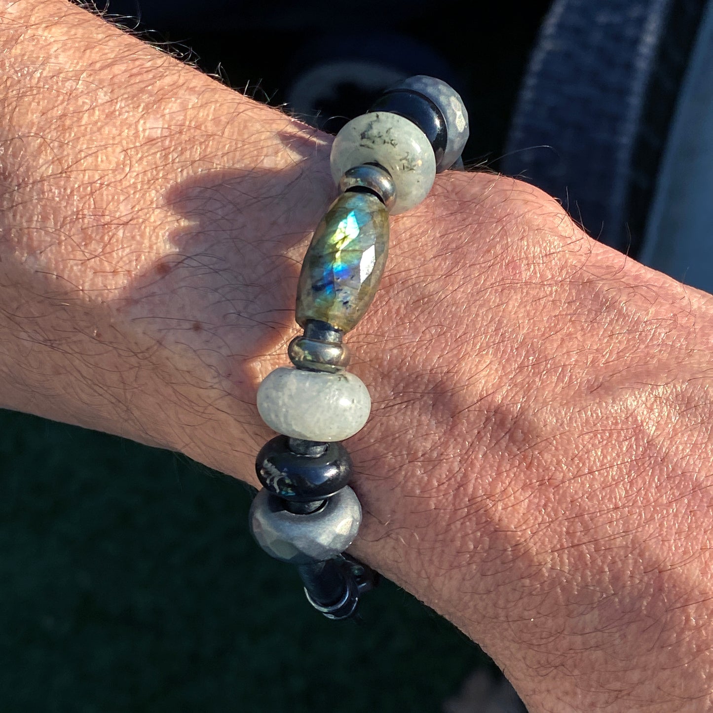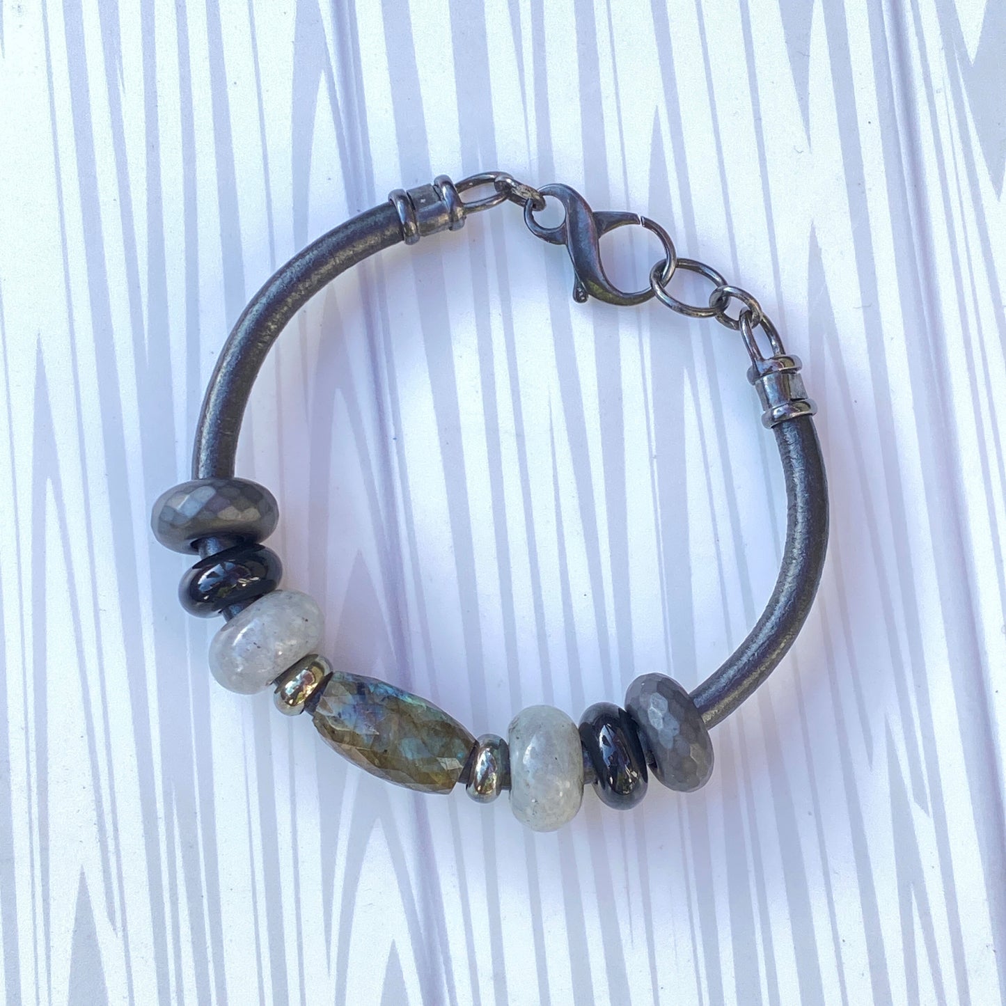 Labradorite gemstone Leather Bracelet with Hematite and Black Obsidian