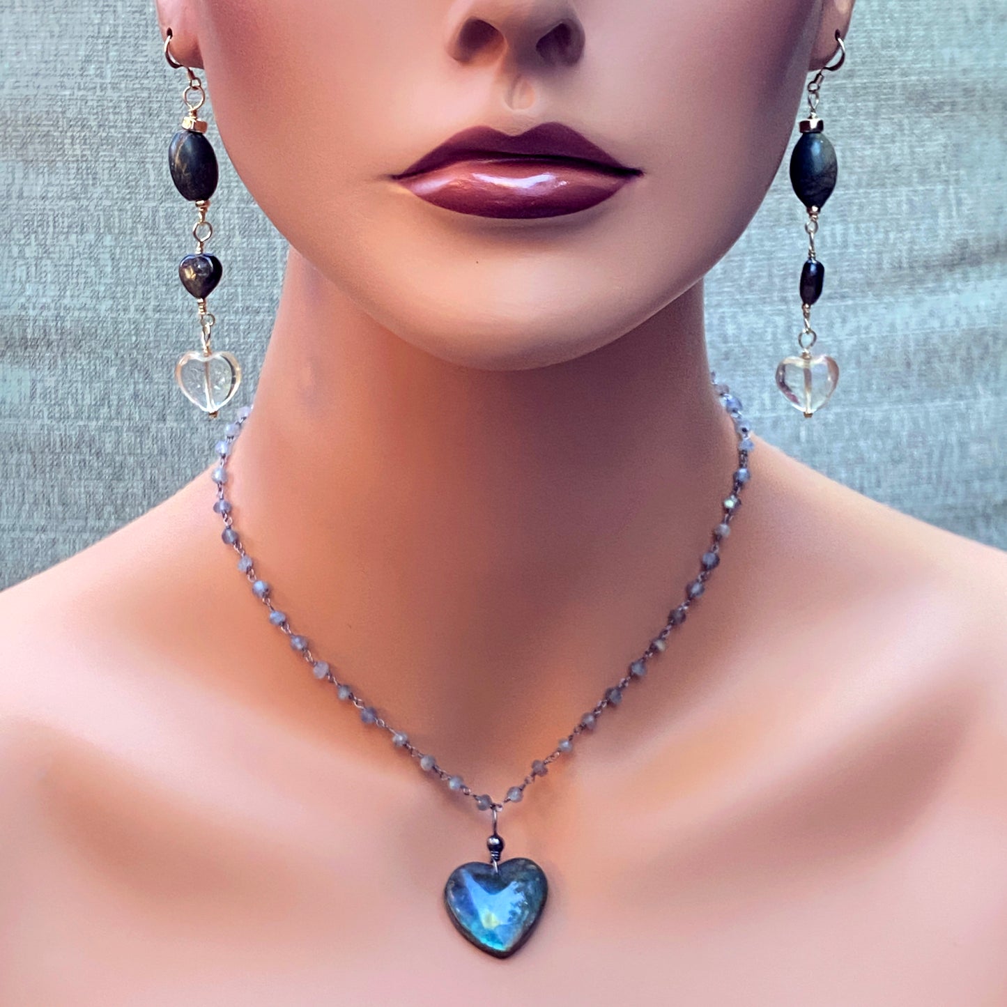 Blue Fire Labradorite Heart Pendant on Labradorite Wrapped Sterling Silver Chain