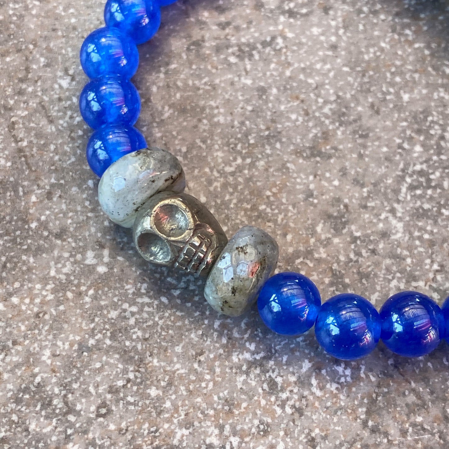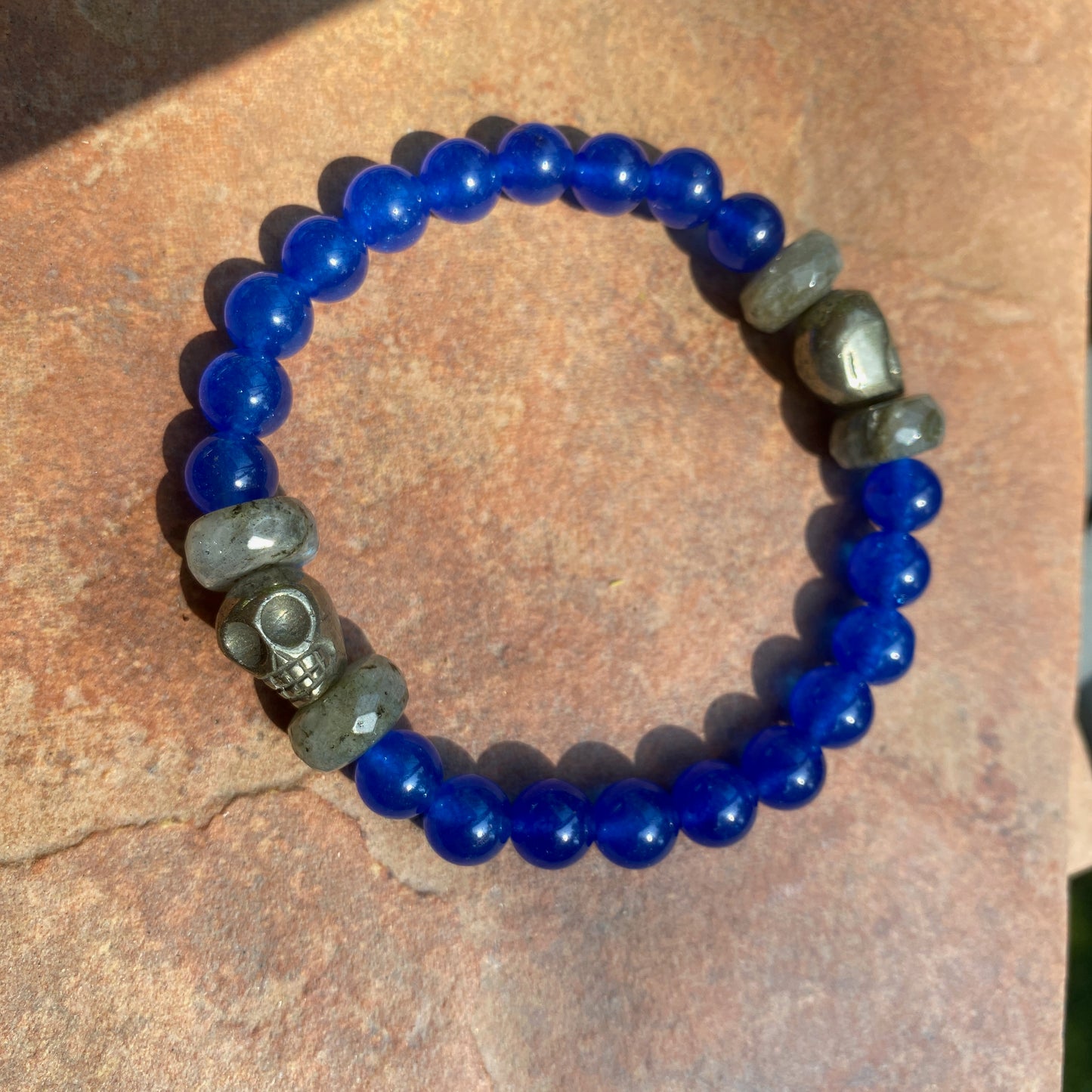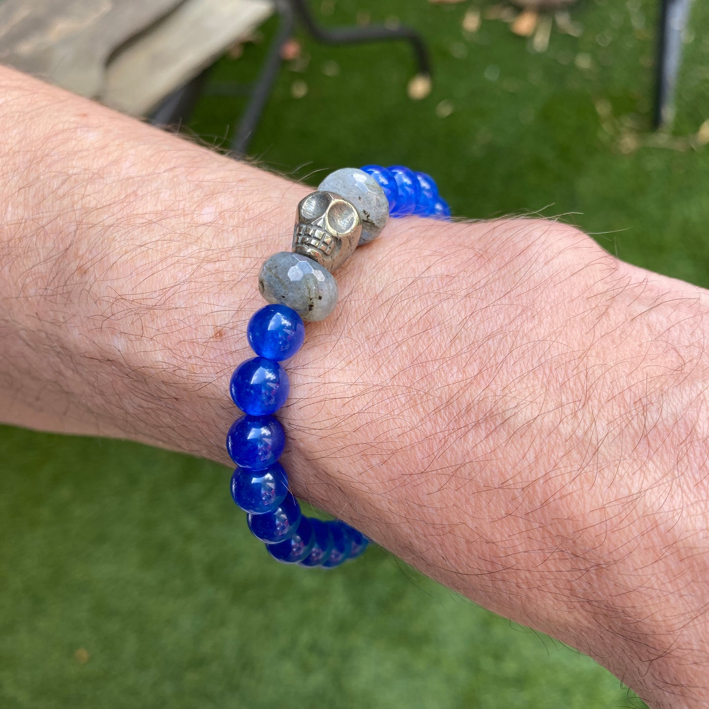 Men’s Blue onyx, pyrite skulls, and labradorite gemstone stretch bracelet