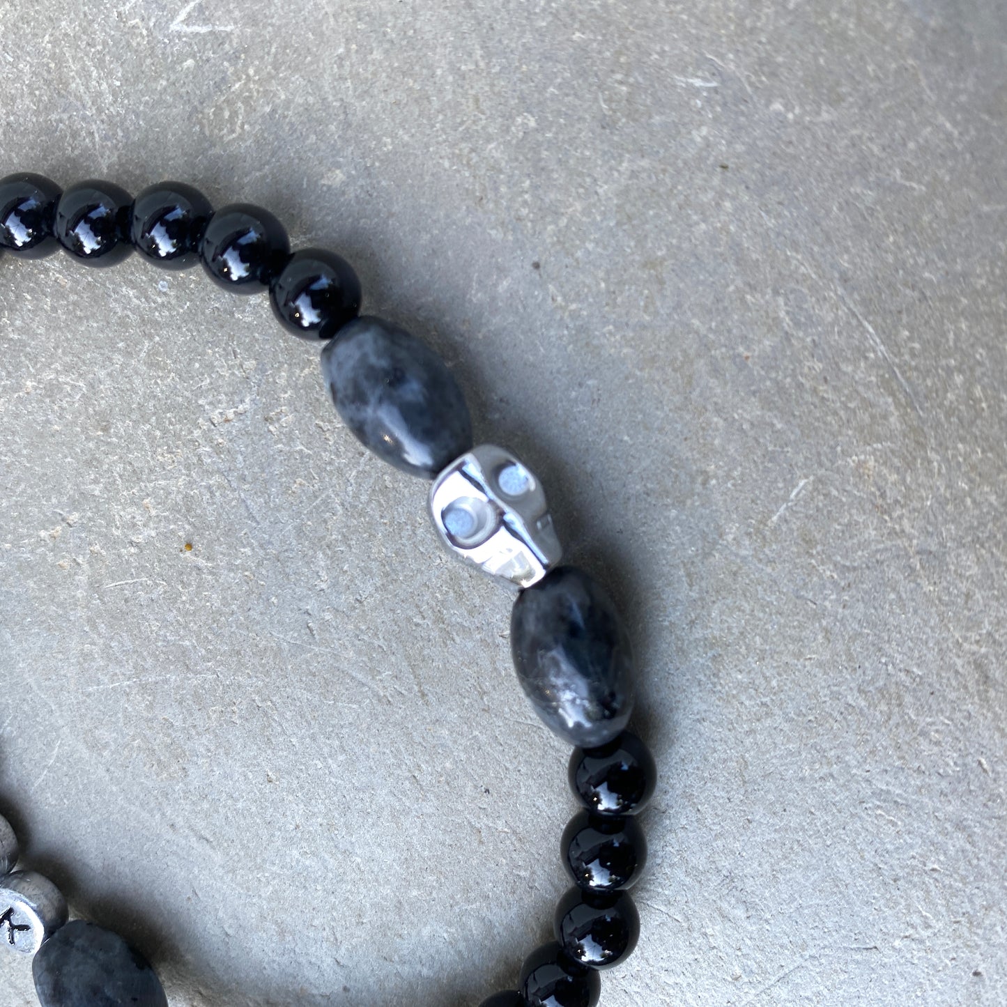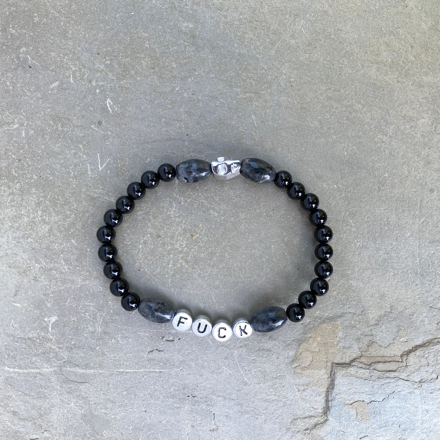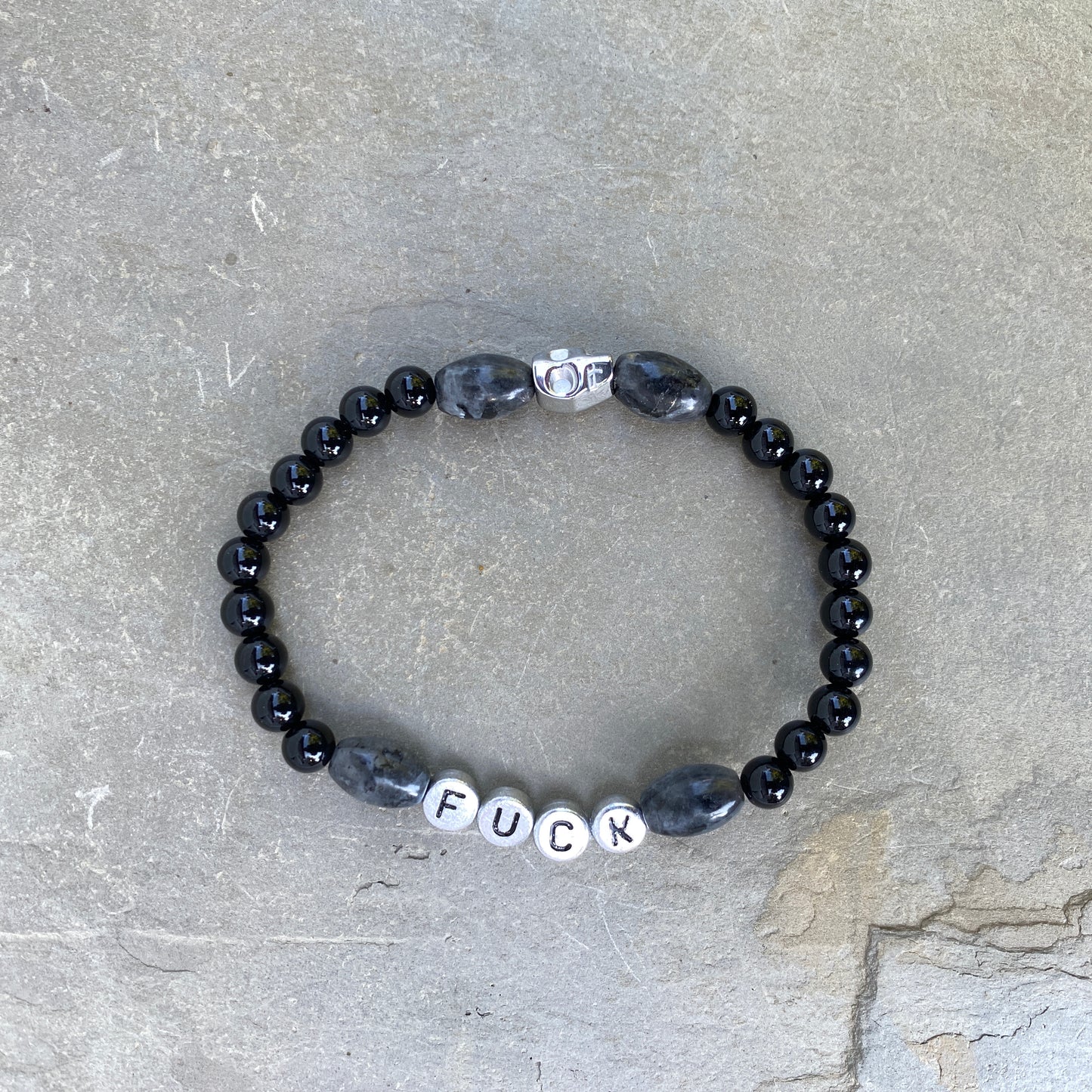Men’s onyx and black labradorite "Fuck" stretch bracelet