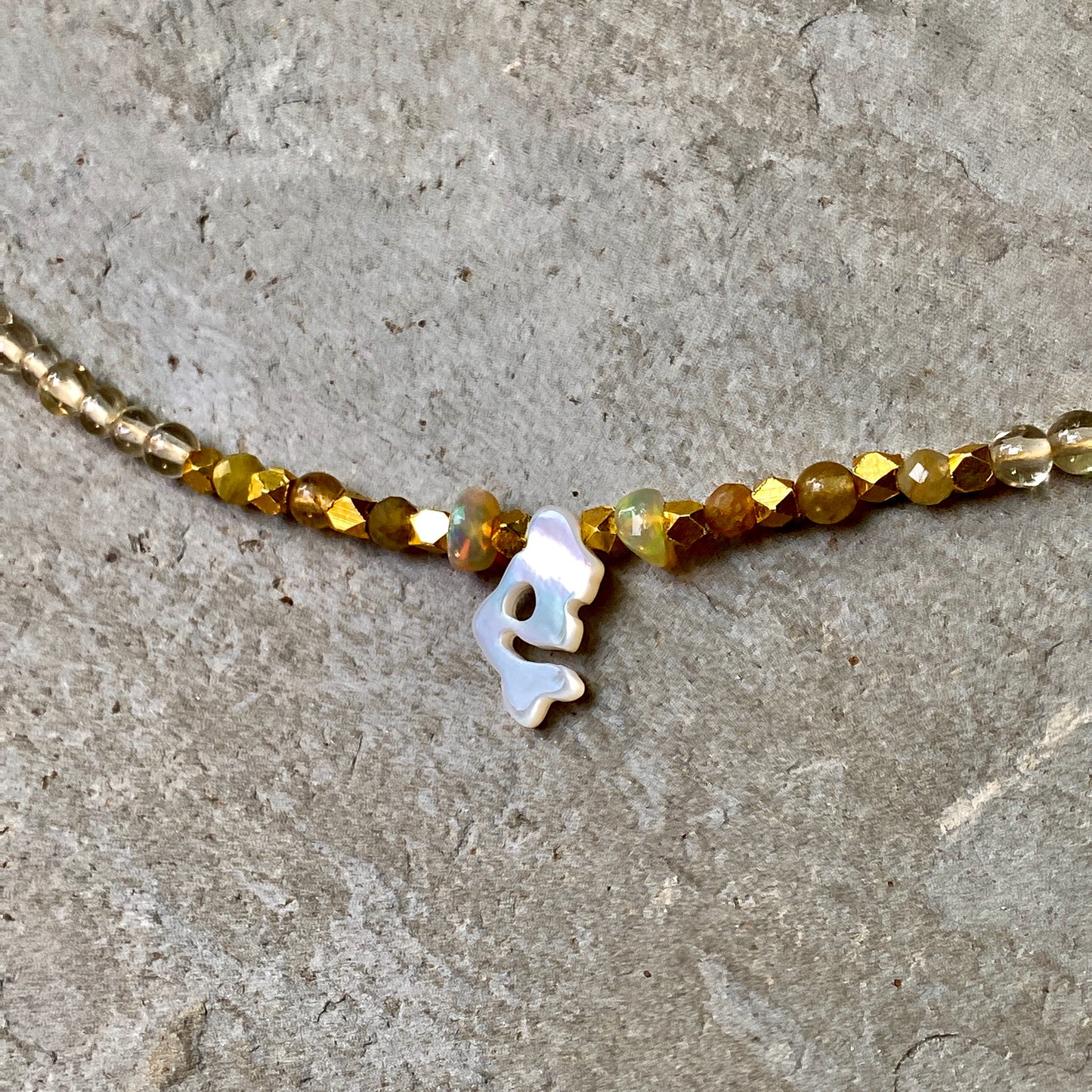 Mother of Pearl Mermaid choker with lemon Quartz, tourmaline and Ethiopian Fire Opals