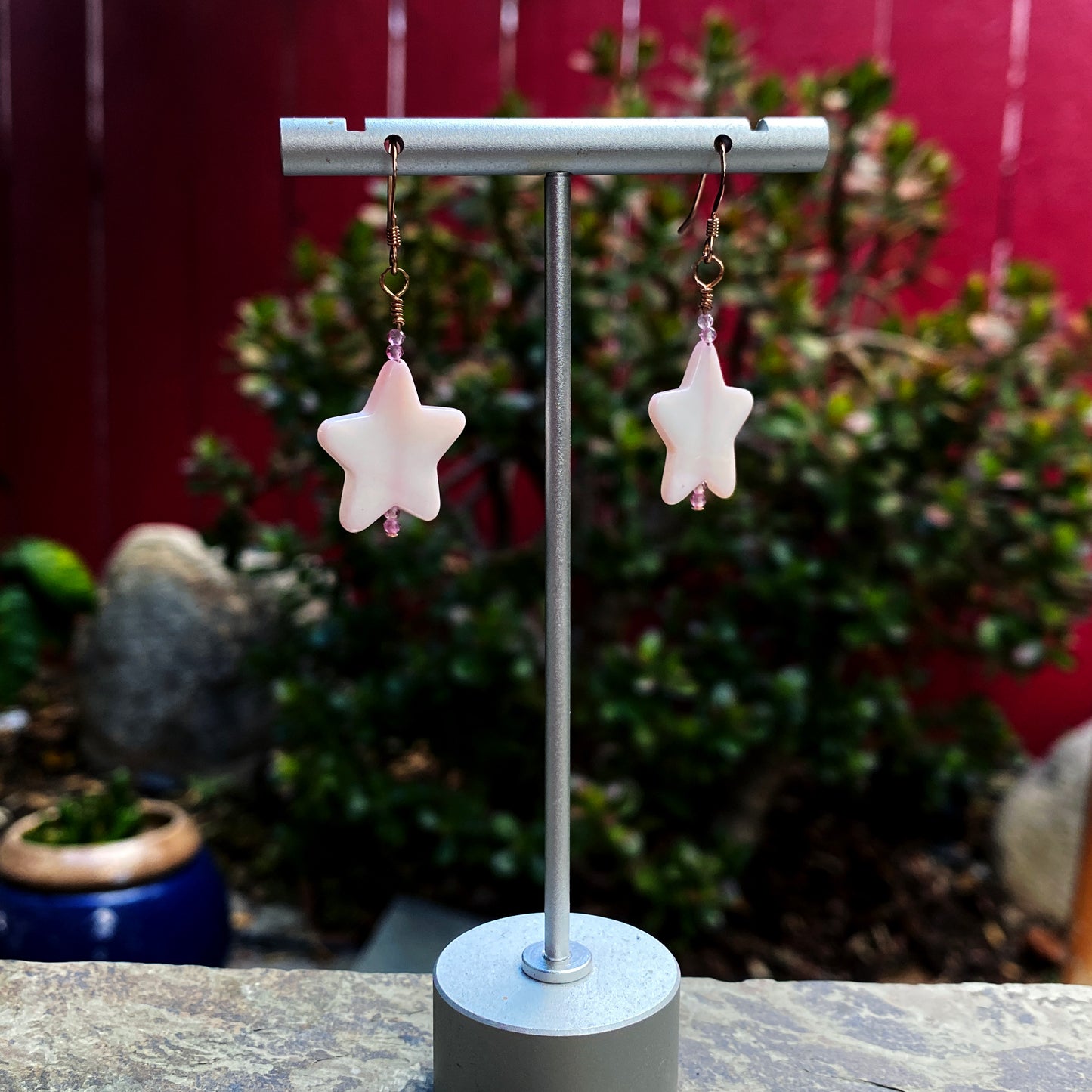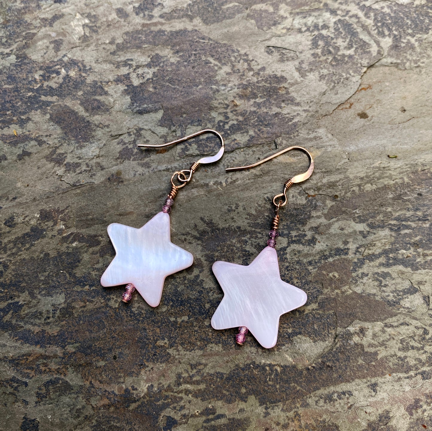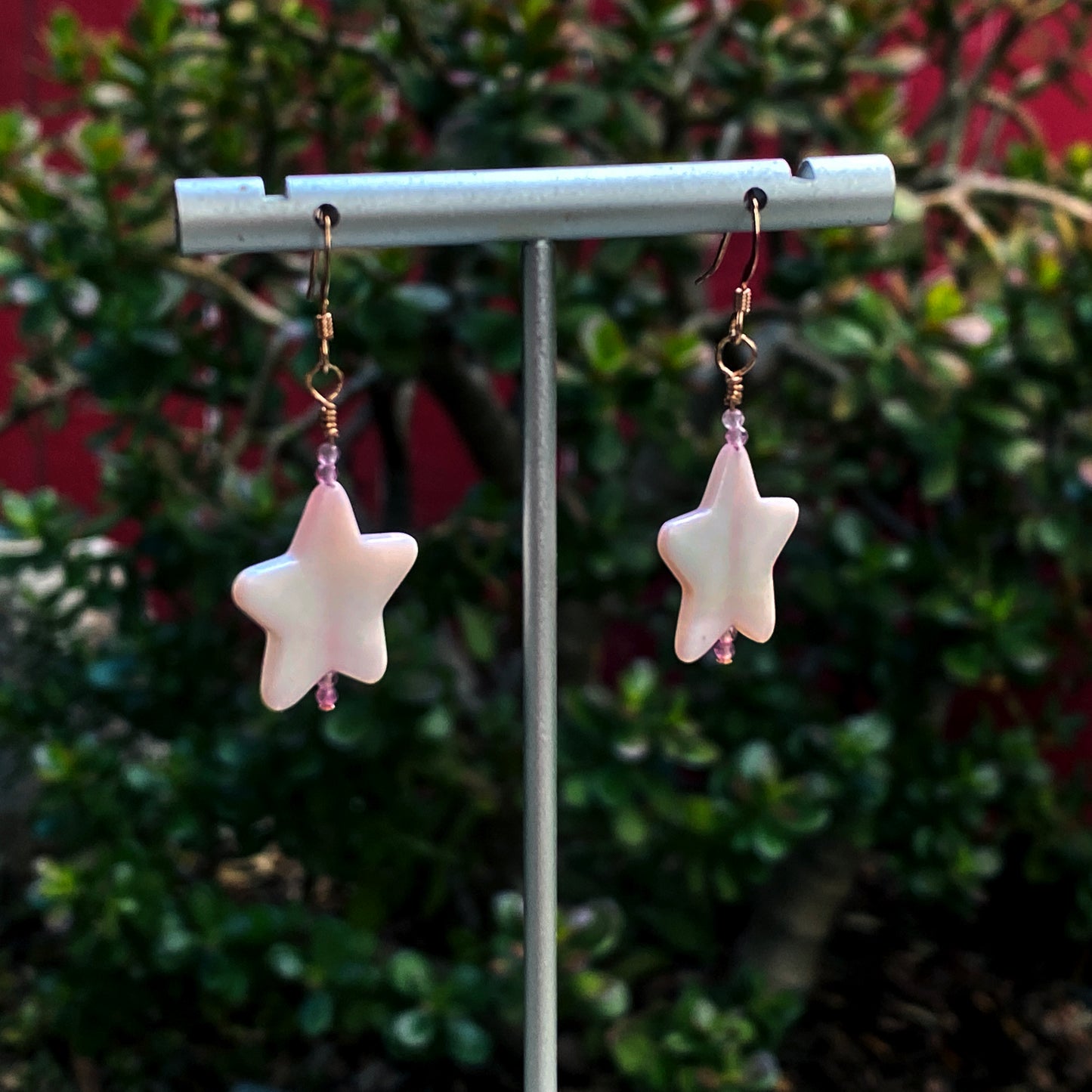 Mother of pearl star and pink topaz with 14 kt rose gold filled drop earrings